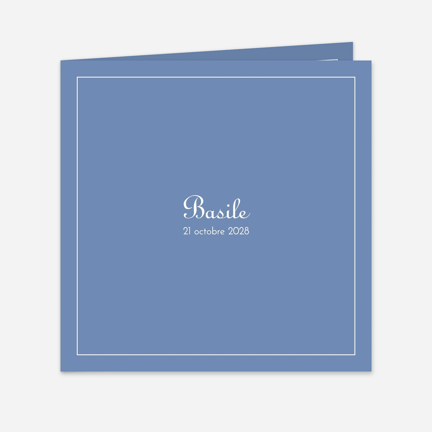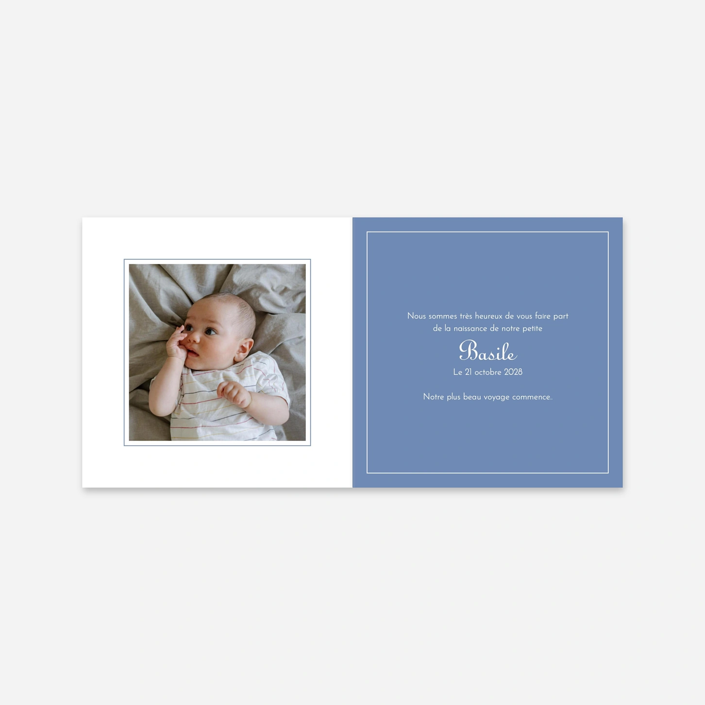 Le faire-part de naissance Classique liseré 1 photo allie tradition et modernité pour une annonce élégante. Sur la première page, le prénom de votre bébé se distingue sur un aplat de couleur délicat. Au verso, vous pouvez insérer une photo lumineuse de votre enfant, de bonne résolution et prise à la lumière du jour, pour un rendu optimal. Personnalisez votre texte avec un large choix de polices sur notre éditeur en ligne. Ce faire-part est disponible en plusieurs coloris : rose, bleu, terracotta, beige texturé ou vert. Créez un souvenir inoubliable avec ce faire-part raffiné.