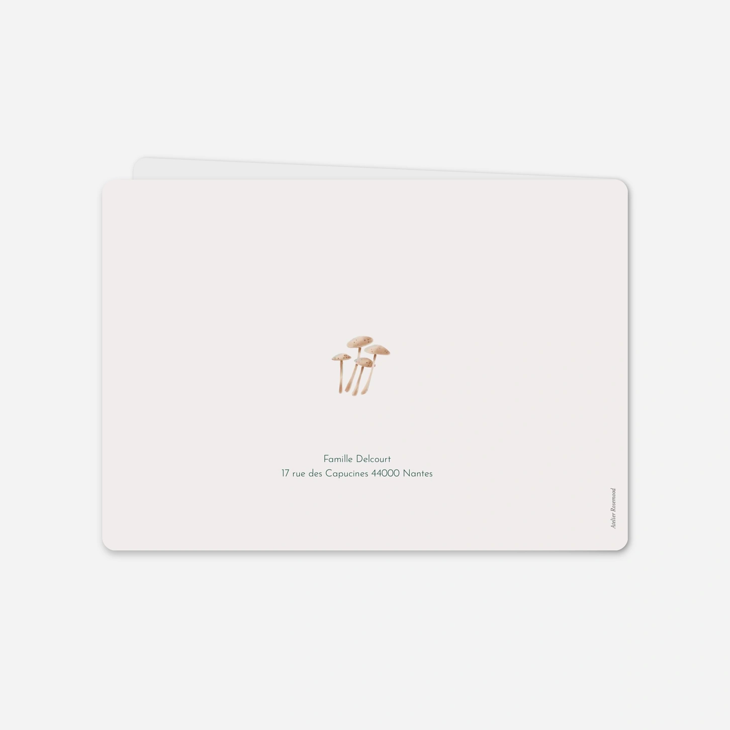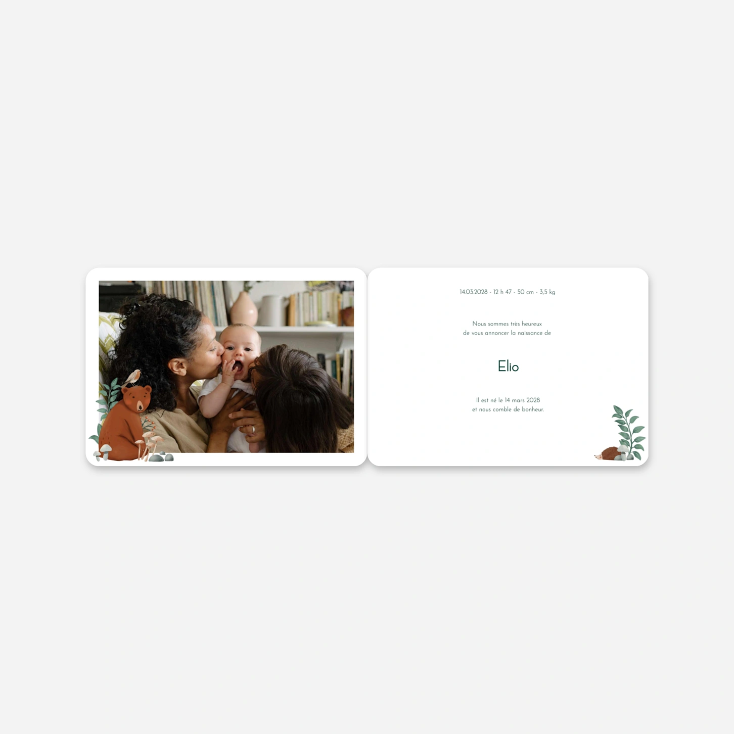 Le faire-part de naissance « Mon petit bois » invite vos proches dans un univers tendre et poétique pour annoncer l’arrivée de votre enfant. Illustré d’un décor inspiré de la nature et peuplé de jolis animaux, ce faire-part de naissance personnalisé met en valeur votre photo avec beaucoup de douceur. Facile à personnaliser en ligne avec votre texte et vos images, il est imaginé par nos créateurs et imprimé avec soin dans nos propres ateliers en France et en Allemagne, sur des papiers premium. Vous pouvez également commander un échantillon gratuit pour découvrir la qualité de nos impressions avant de faire votre choix.