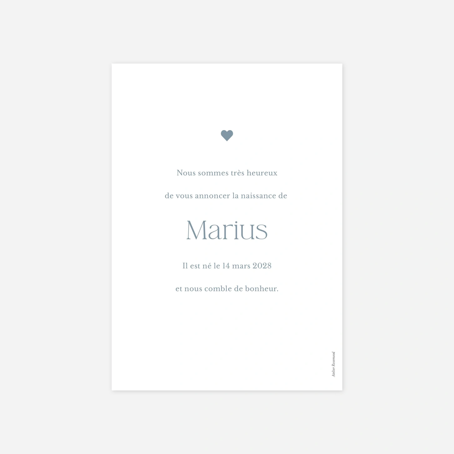 Le faire-part de naissance Mon Tout célèbre avec tendresse l’arrivée de votre bébé. Sa mise en page douce et épurée met en lumière la plus belle des annonces : la venue de votre enfant. Chaque faire-part de naissance personnalisé est imprimé sur nos papiers de qualité dans nos propres ateliers en France et en Allemagne. Pour être sûrs de votre choix, profitez de nos échantillons gratuits avant de valider votre commande.