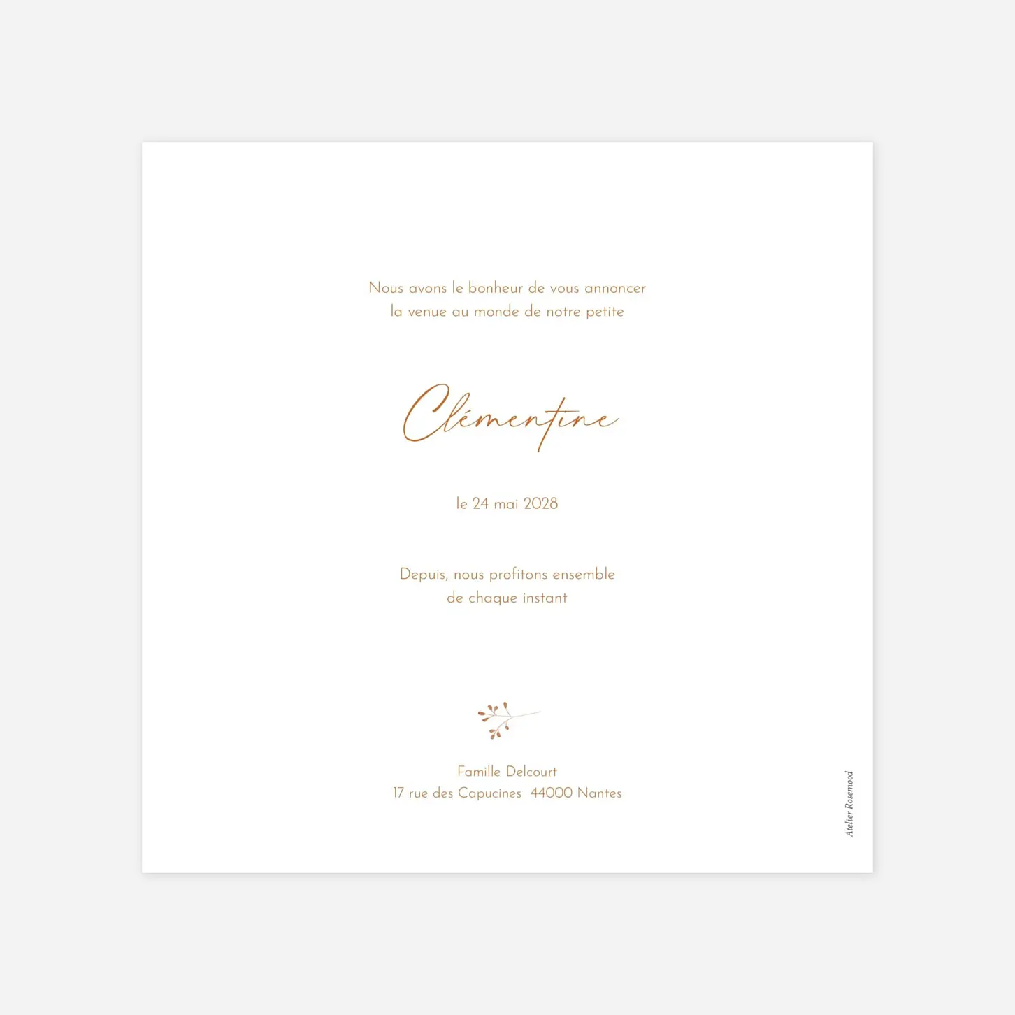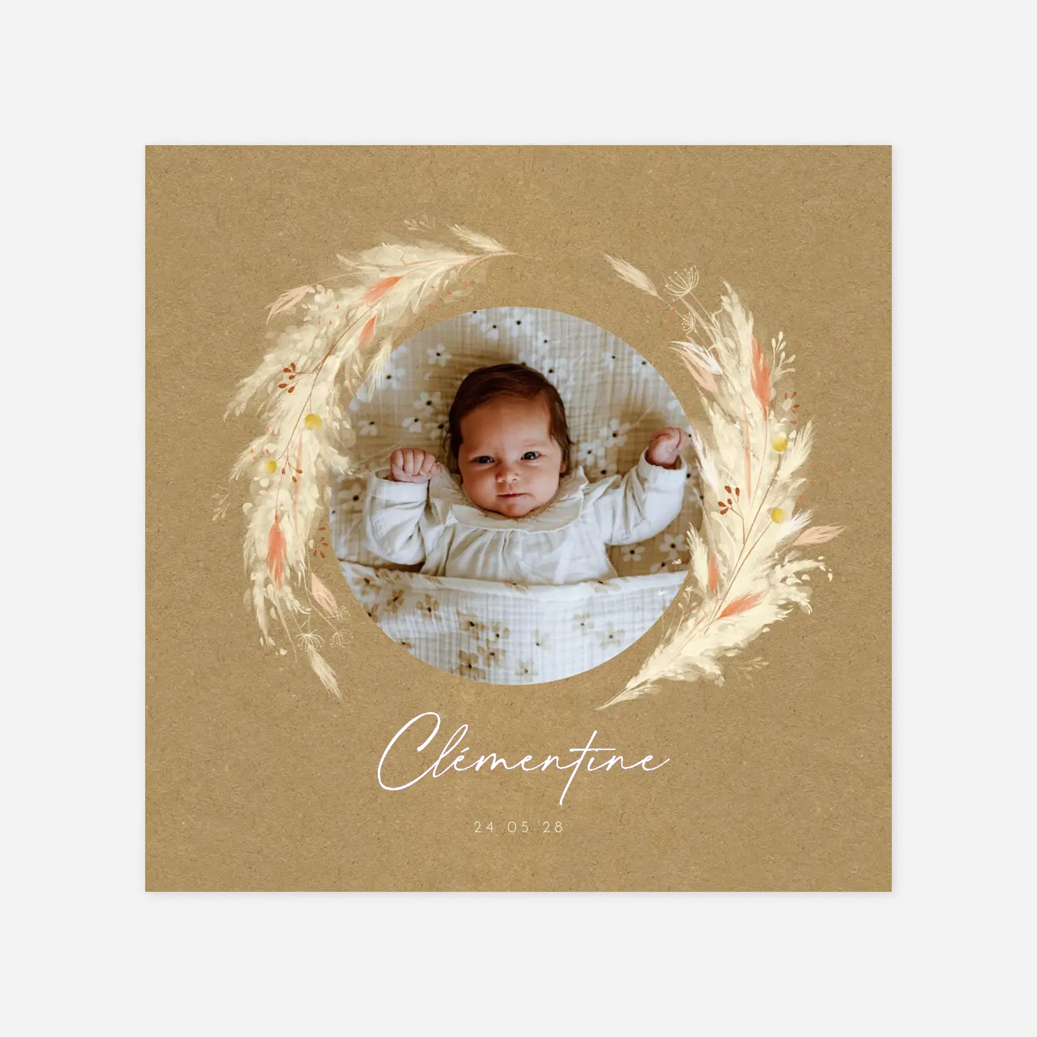 Inspiration bohème et naturelle pour ce délicat faire-part de naissance Pampas fleuries couronne, qui annonce l’arrivée de votre bébé avec douceur et poésie. Herbes de pampa et petites fleurs séchées aux couleurs chaudes de l’été entourent avec élégance la photo de votre enfant, créant un écrin délicat pour célébrer ce moment unique. Son prénom, mis en avant par une typographie manuscrite raffinée, ajoute une touche personnelle et intemporelle à cette composition harmonieuse. Impression haut de gamme sur nos plus beaux papiers de création.