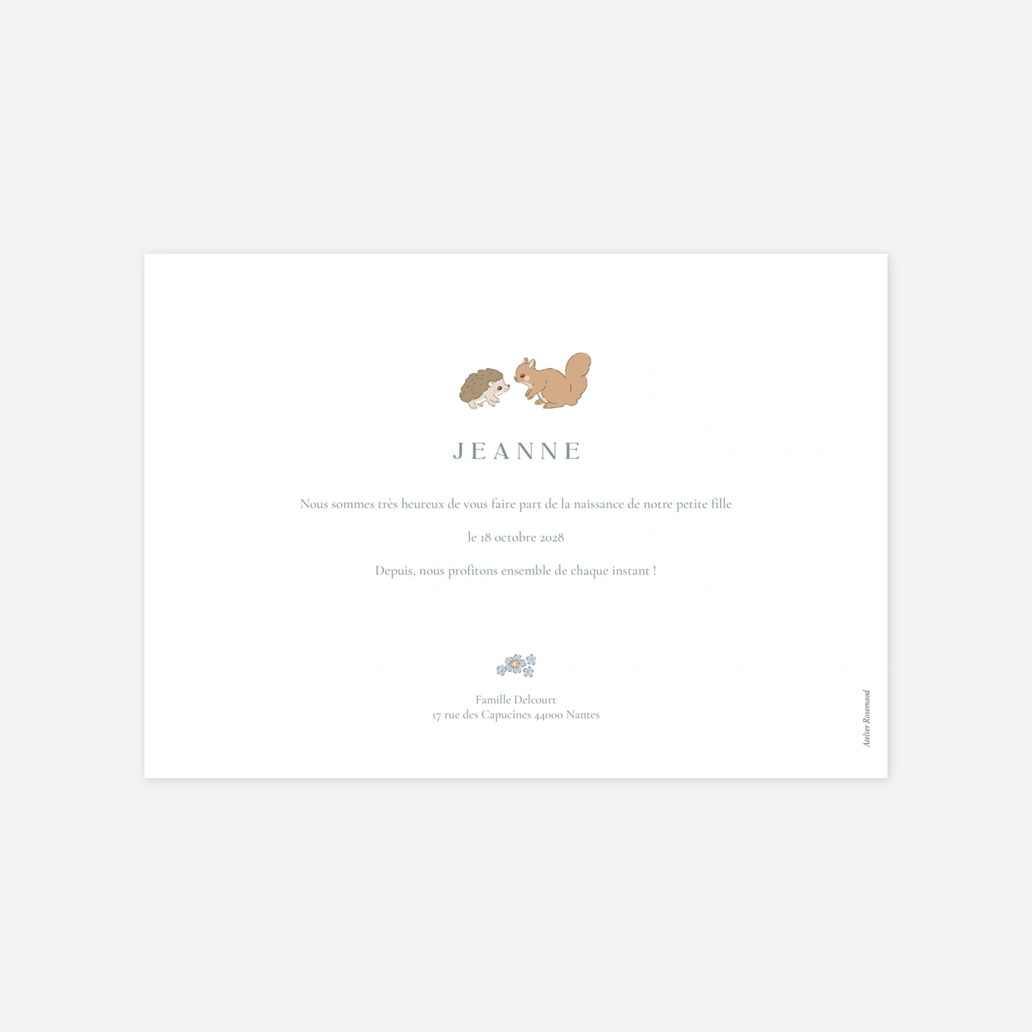 Sur le faire-part de naissance « Parmi les fleurs » un petit lapin, un écureuil et un hérisson se nichent tendrement au milieu de couronnes fleuries, créant une atmosphère douce et poétique. Ces motifs bucoliques accompagnent vos photos avec élégance et apportent une touche d’émerveillement à l’annonce de la naissance. Disponible en plusieurs formats, ce modèle s’adapte à vos envies tout en mettant en valeur votre bébé.