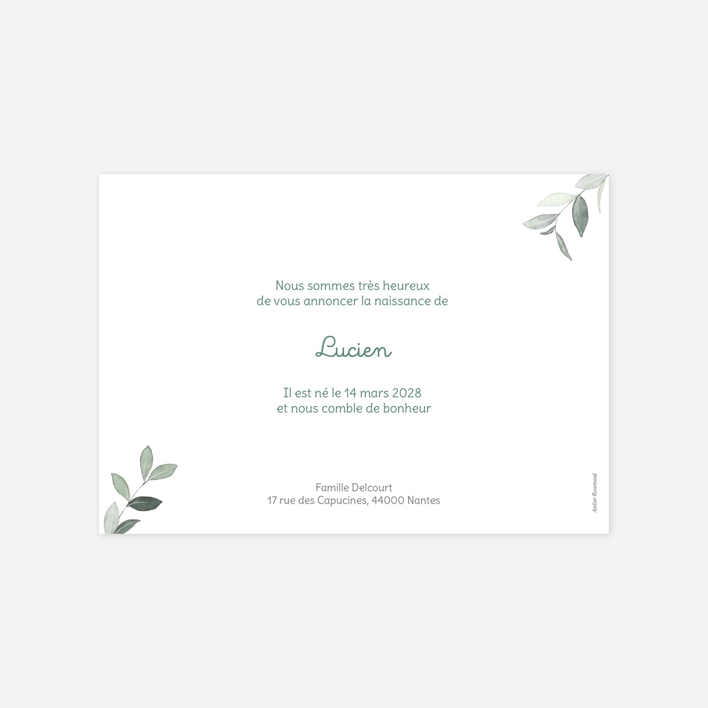 Le faire-part de naissance Petit Jardin respire la douceur et la fraîcheur pour célébrer l’arrivée de votre bébé. Ses délicats motifs végétaux entourent avec poésie vos plus tendres photos et vos mots d’annonce. Conçu dans nos propres ateliers en France et en Allemagne, il allie qualité d’impression et charme intemporel. Découvrez ce faire-part de naissance personnalisé grâce à nos échantillons gratuits avant de le partager avec vos proches.