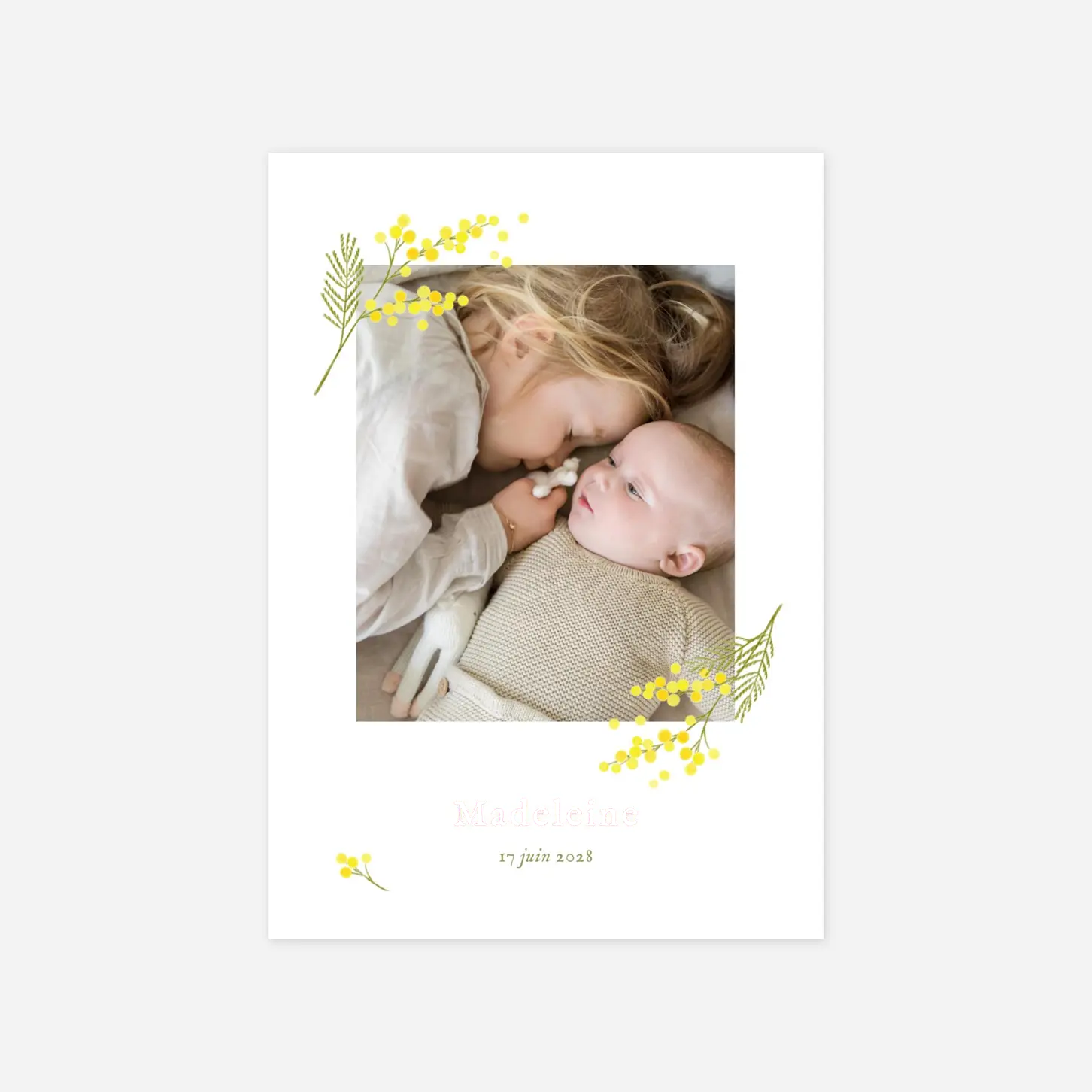 Les premières fleurs du printemps s’invitent autour de la jolie photo de bébé, emplies de fraîcheur et de délicatesse. Poétique et lumineux, le faire-part de naissance Petit mimosa évoquera l’idée de renouveau et de bonheur.
