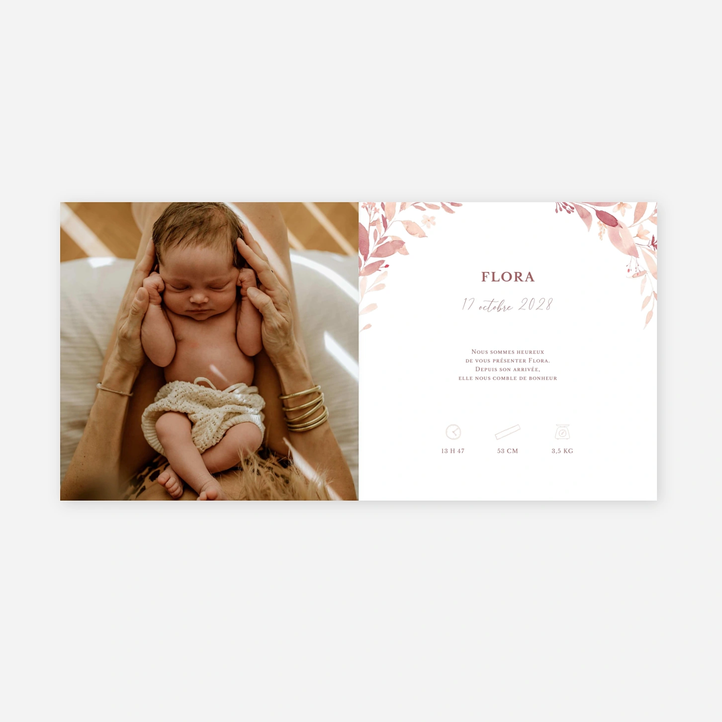 Le faire-part de naissance « Petite fleur » dévoile un univers délicat et poétique pour annoncer en douceur l’arrivée de votre enfant. De fines illustrations florales viennent entourer la photo et apportent à ce faire-part de naissance personnalisé une touche de tendresse et d’élégance naturelle. Le texte et les photos se configurent facilement en ligne afin de créer une annonce qui vous ressemble. Imprimé avec soin sur nos papiers premium dans nos propres ateliers en France et en Allemagne, ce modèle est disponible en échantillon gratuit pour vous permettre d’en apprécier toute la qualité.