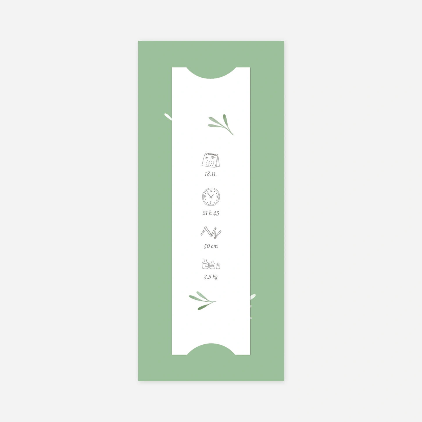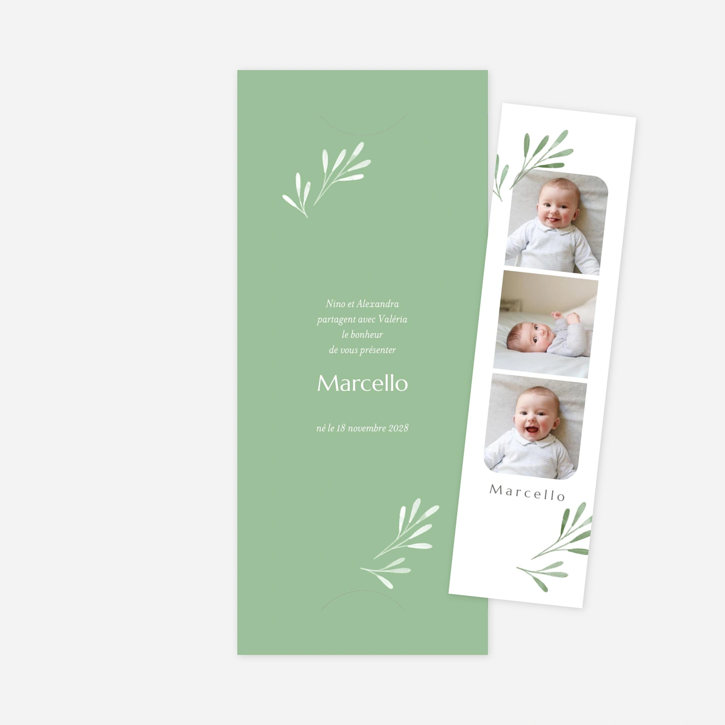 Laissez-vous enchanter par le faire-part de naissance Picto végétal, une annonce originale et pleine de douceur. Ses délicats feuillages aquarellés sublimeront votre plus belle photo, tandis que des pictogrammes symboliseront les informations clés de la naissance. Vous aurez le choix entre deux coloris pour les illustrations : vert ou avec une touche de rose. Personnalisez facilement votre faire-part depuis notre éditeur en ligne, en ajustant le texte et le style à votre convenance. Découvrez également notre collection de faire-part de naissance nature, où d'autres créations aux motifs botaniques vous attendent pour célébrer ce moment unique.