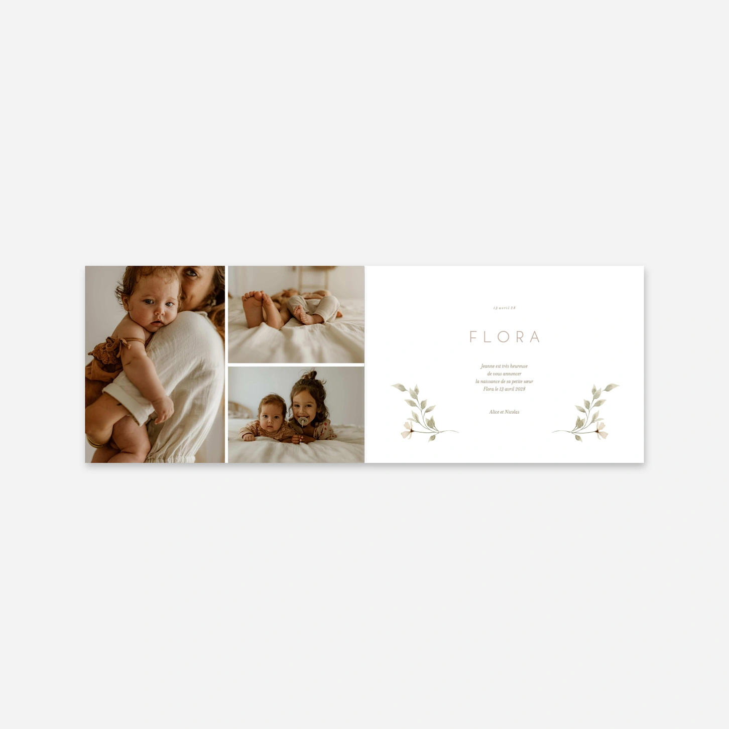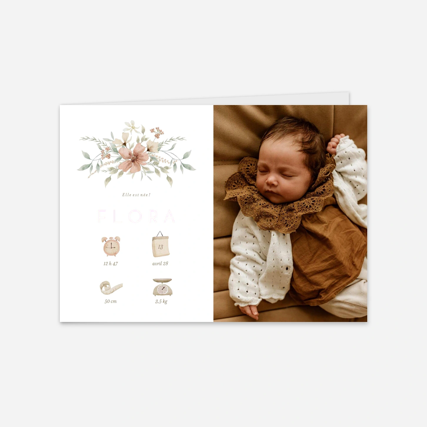 Le faire-part de naissance « Premiers sourires » célèbre l'arrivée de votre enfant avec une douceur infinie, mettant en lumière son premier portrait au milieu de délicates illustrations florales. Ce modèle poétique vous permet de partager les précieux détails de sa venue au monde grâce à des icônes illustrées avec soin par nos designers. Pour vous assurer un rendu parfait, chaque création est imprimée avec une précision haute définition au sein de nos propres ateliers. Vous pouvez également commander un échantillon gratuit pour apprécier la qualité de nos papiers premium avant de finaliser votre commande. Personnalisez votre faire-part de naissance avec photo en quelques clics pour offrir un souvenir inoubliable à vos proches.