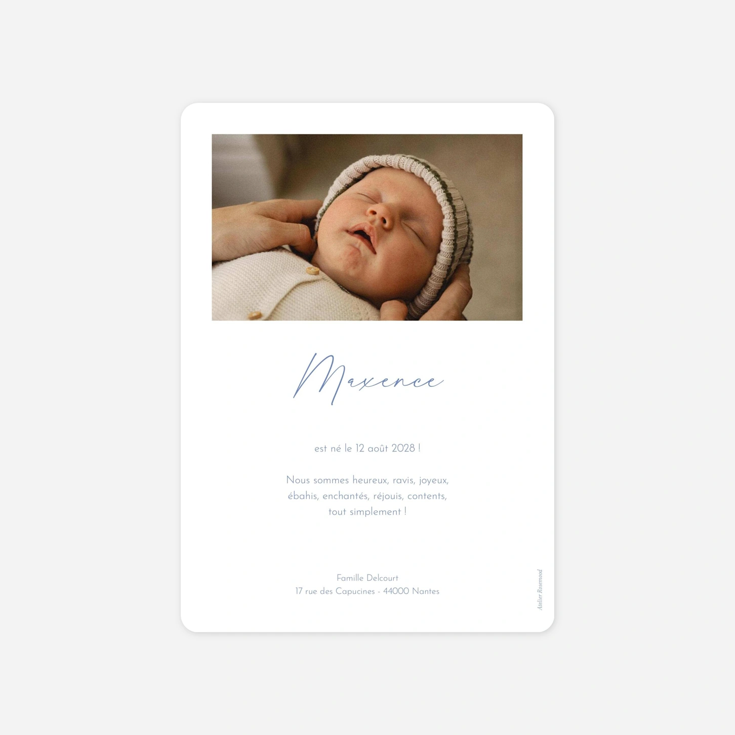 Le faire-part de naissance « Rêve bleu » accompagne l’annonce de votre bébé d’une touche poétique et onirique. Un gracieux cheval, entouré d’étoiles scintillantes, invite vos proches à partager ce moment magique. La possibilité d’ajouter de la dorure illumine délicatement le design et apporte une finition élégante à vos photos. Créé par nos designers et imprimé avec soin dans nos ateliers en France et en Allemagne, ce modèle transforme l’annonce de la naissance en un souvenir précieux.