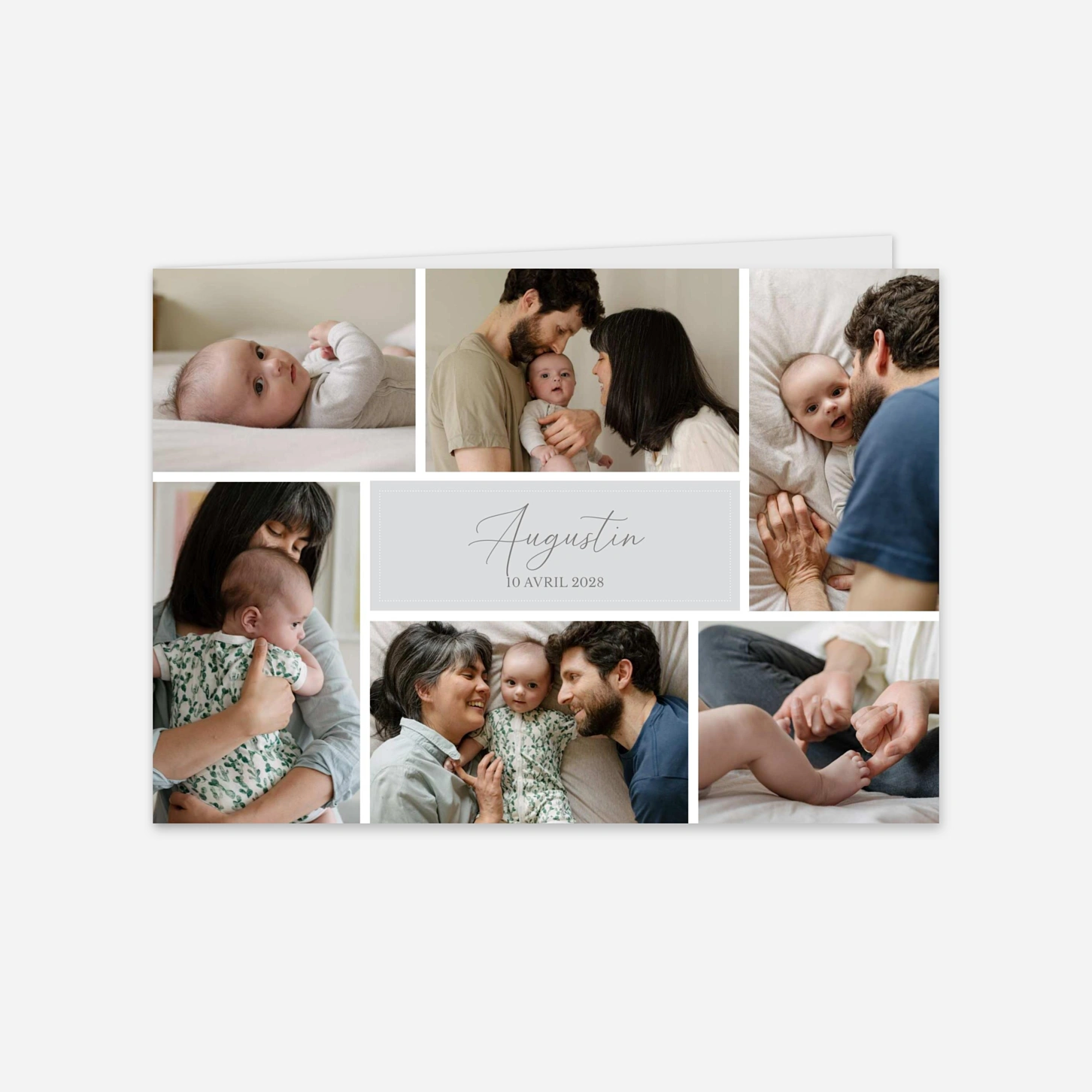Le faire-part de naissance «Trésor de Vie» célèbre avec tendresse l’arrivée de votre bébé à travers un élégant collage de photos empreint d’émotion. Chaque image capture la douceur des premiers instants partagés, pour un souvenir unique et sincère. Imprimé sur nos papiers premium dans nos propres ateliers en France et en Allemagne, il allie authenticité et qualité d’exception. Profitez d’un échantillon gratuit pour découvrir ce faire-part de naissance personnalisé avant de le partager avec vos proches.