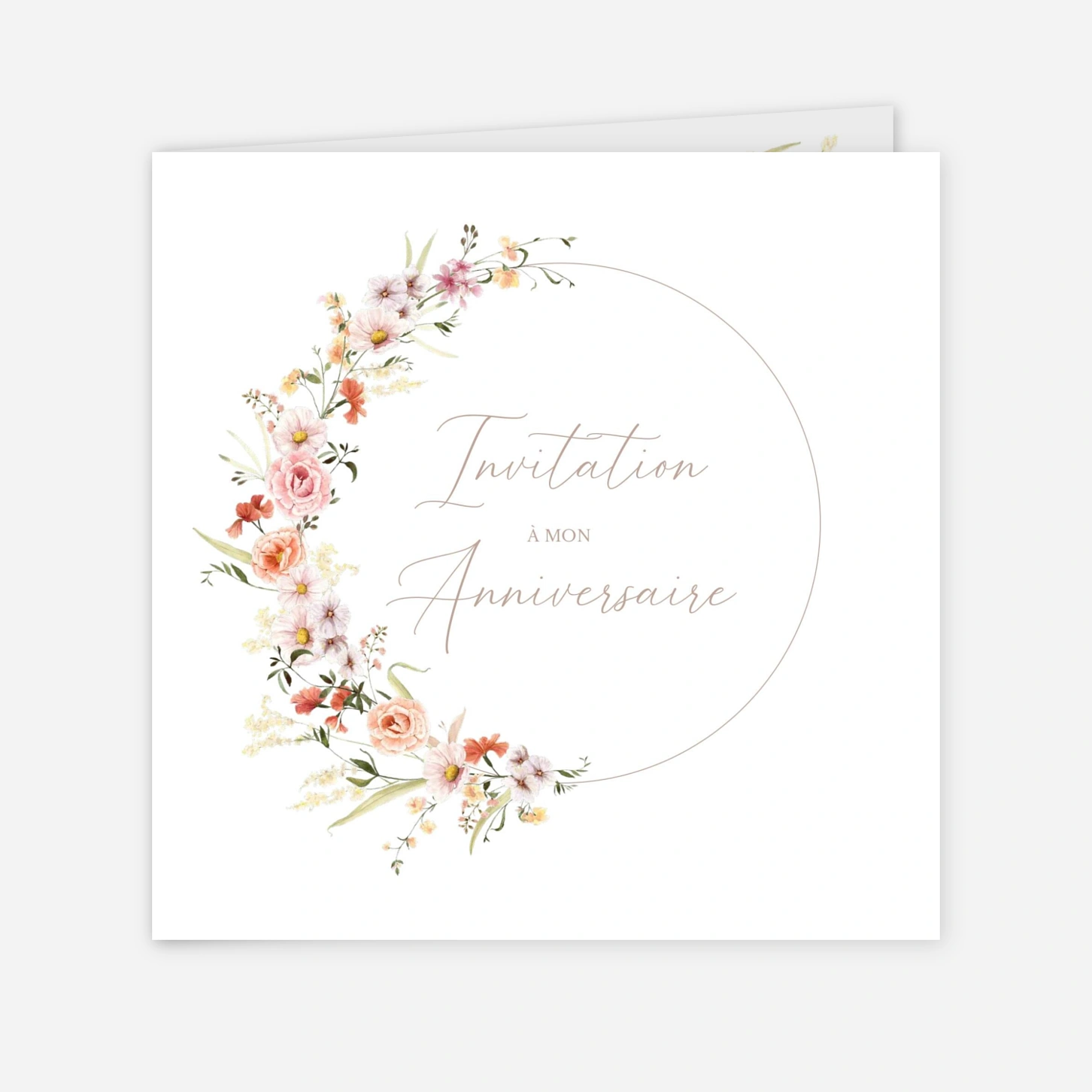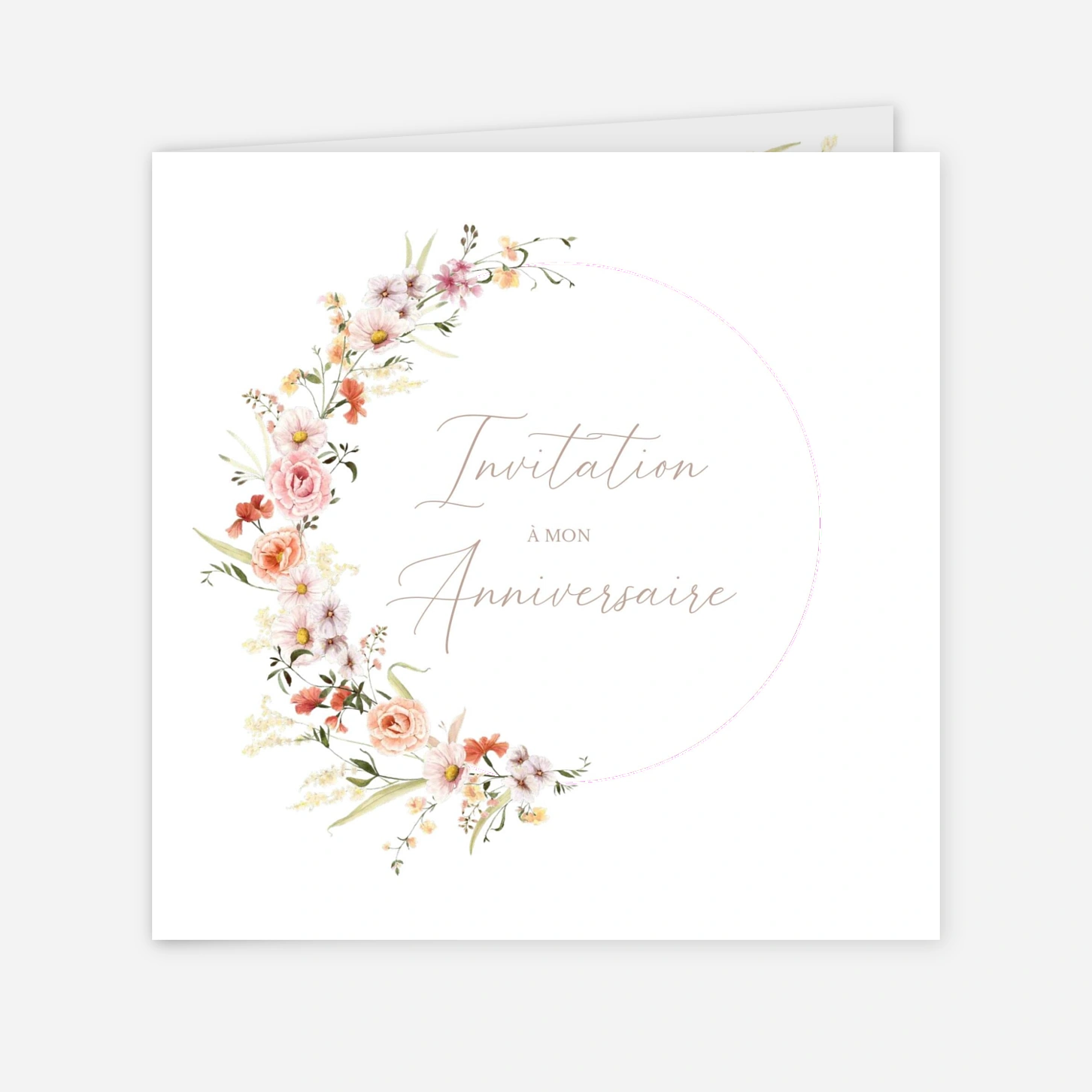 L'invitation d'anniversaire « Bouquet printanier » charmera vos proches par son élégance naturelle et ses délicates illustrations florales. Ce modèle poétique, orné d'une couronne de fleurs champêtres, est idéal pour annoncer votre fête avec une touche de douceur et de fraîcheur. Chaque carte bénéficie de notre expertise avec une impression haute précision réalisée au sein de nos propres ateliers. Profitez de nos papiers premium pour offrir à vos invités une création de qualité qui restera un joli souvenir de cet événement. Seriez-vous intéressé par la création d'un menu assorti à ce design pour votre réception ?