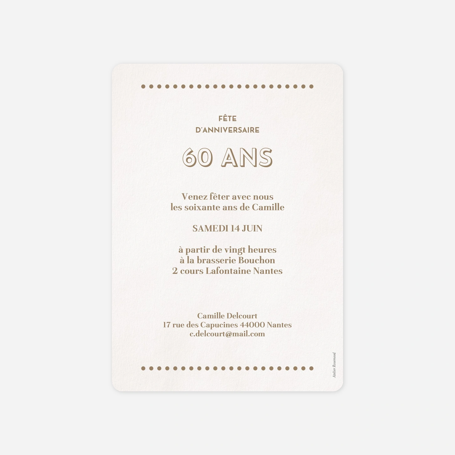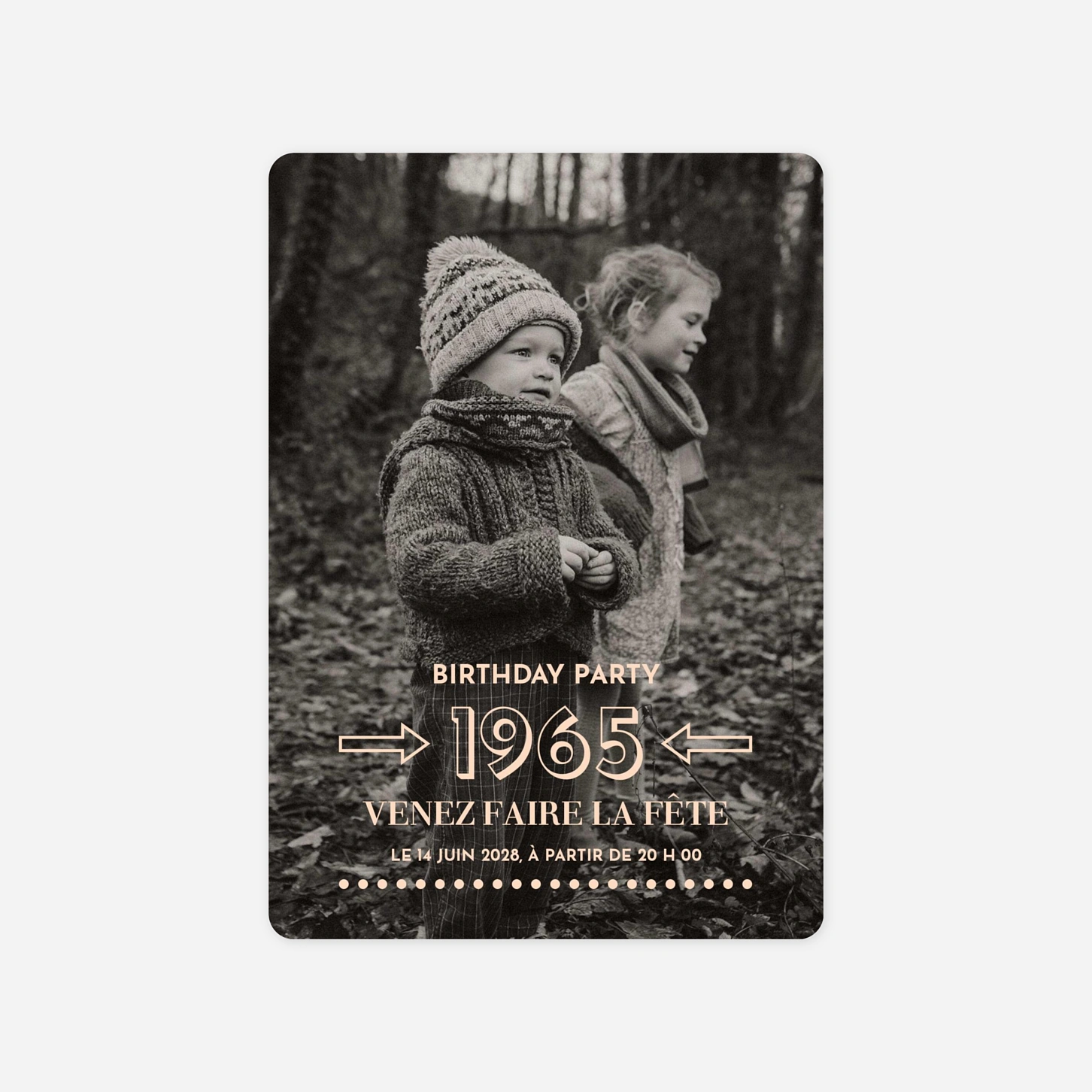 Plongez dans la nostalgie avec l'invitation d'anniversaire « Douce époque », un modèle au charme vintage qui mettra merveilleusement en lumière vos plus beaux souvenirs d'enfance. Cette création unique, conçue au sein de nos propres ateliers, vous permet de partager votre parcours avec tendresse et élégance pour célébrer vos soixante ans. Grâce à notre outil d'édition, vous profiterez d'une configuration facile de votre texte et de vos photos pour une personnalisation qui vous ressemble. Offrez à vos proches un précieux clin d'œil au passé avant de fêter ensemble ce nouveau chapitre de votre vie. Personnalisez votre création en ligne dès maintenant pour inviter vos convives avec style.