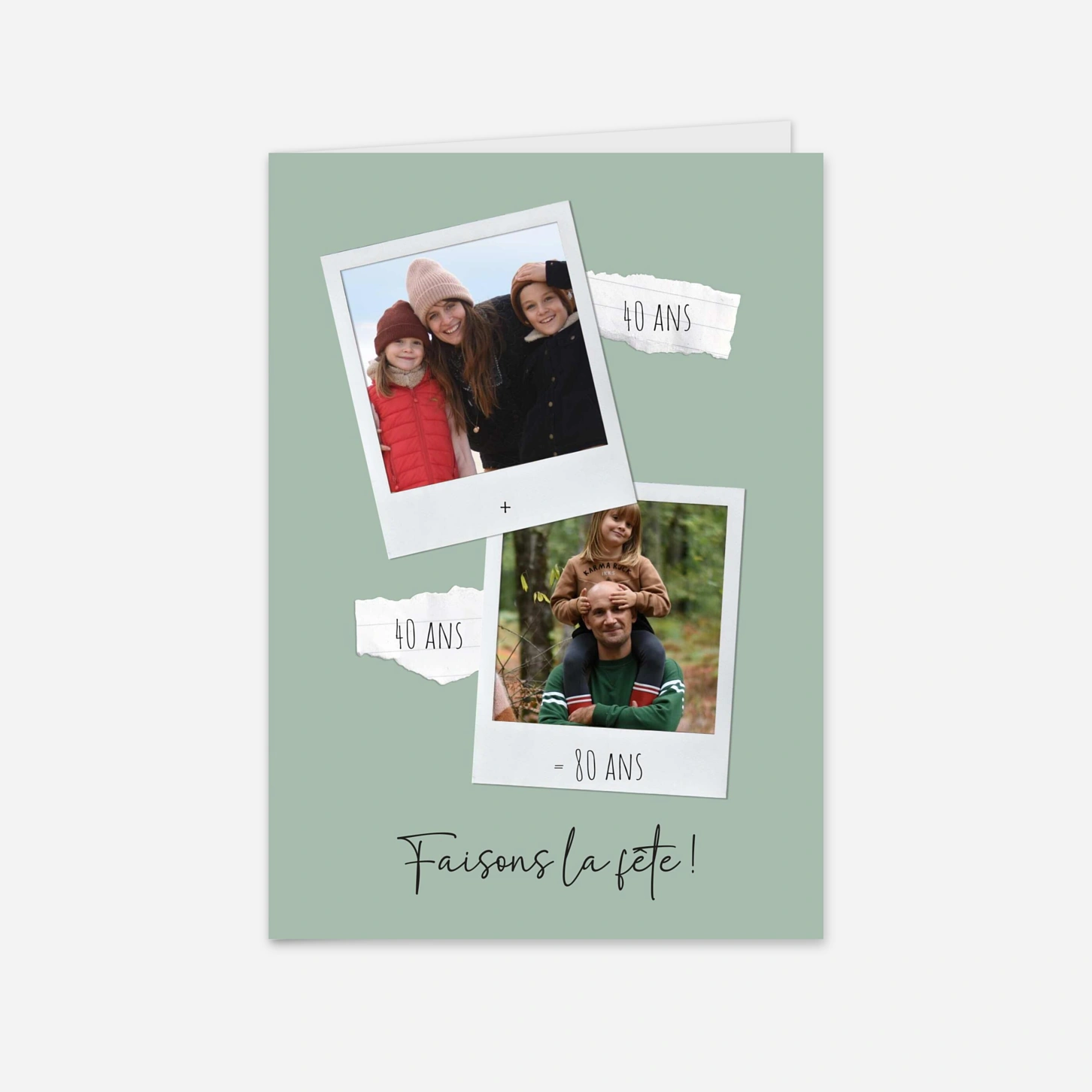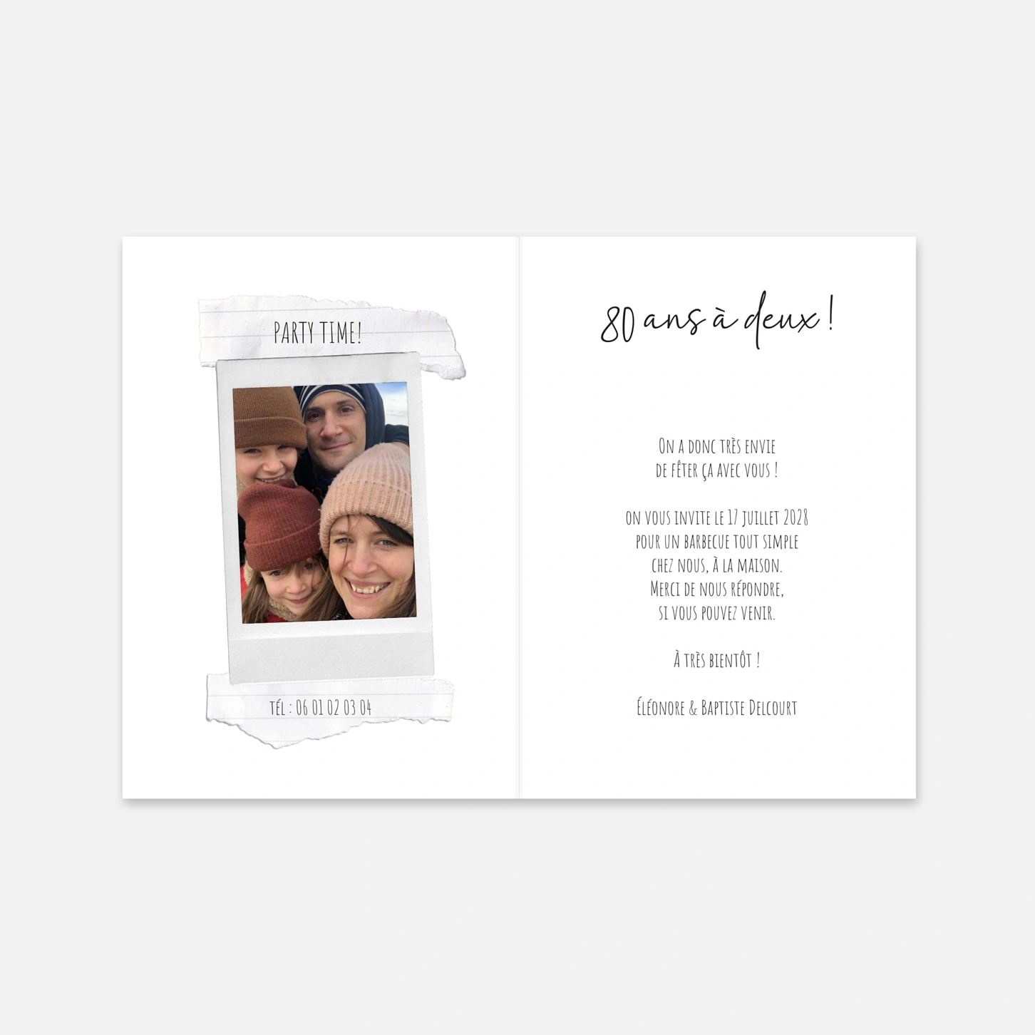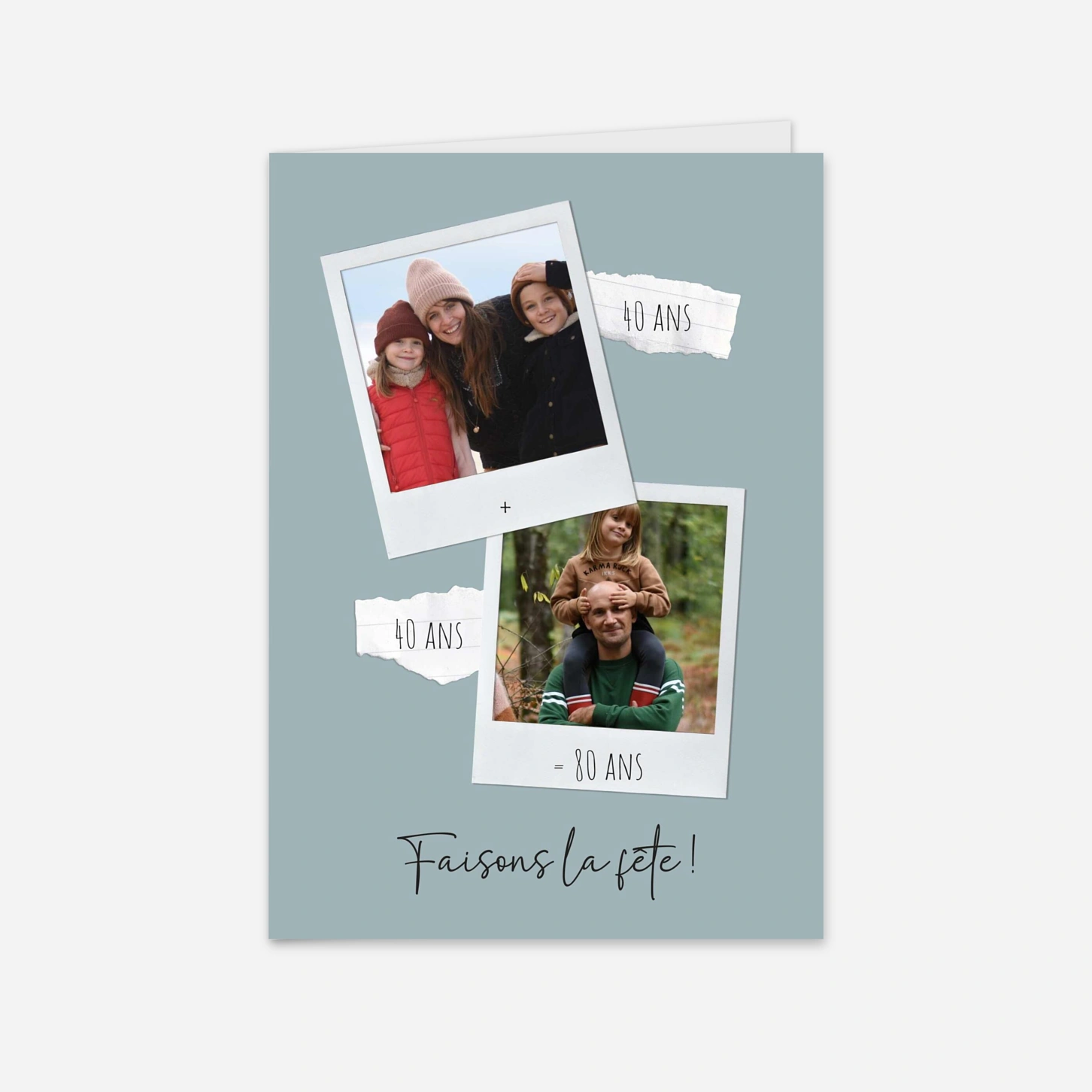 Célébrez un anniversaire exceptionnel avec l'invitation « En duo », un modèle original qui joue sur l'accumulation des années pour doubler le plaisir de faire la fête. Cette invitation d'anniversaire personnalisée vous permet de mettre à l'honneur deux complices grâce à un montage photo créatif façon pêle-mêle de polaroïds. Pour une finition parfaite, chaque modèle est imprimé avec soin dans nos propres ateliers en France ou en Allemagne sur des papiers de haute qualité. Profitez de notre outil d'édition intuitif pour une configuration facile du texte et des photos afin de créer un souvenir unique pour vos invités.