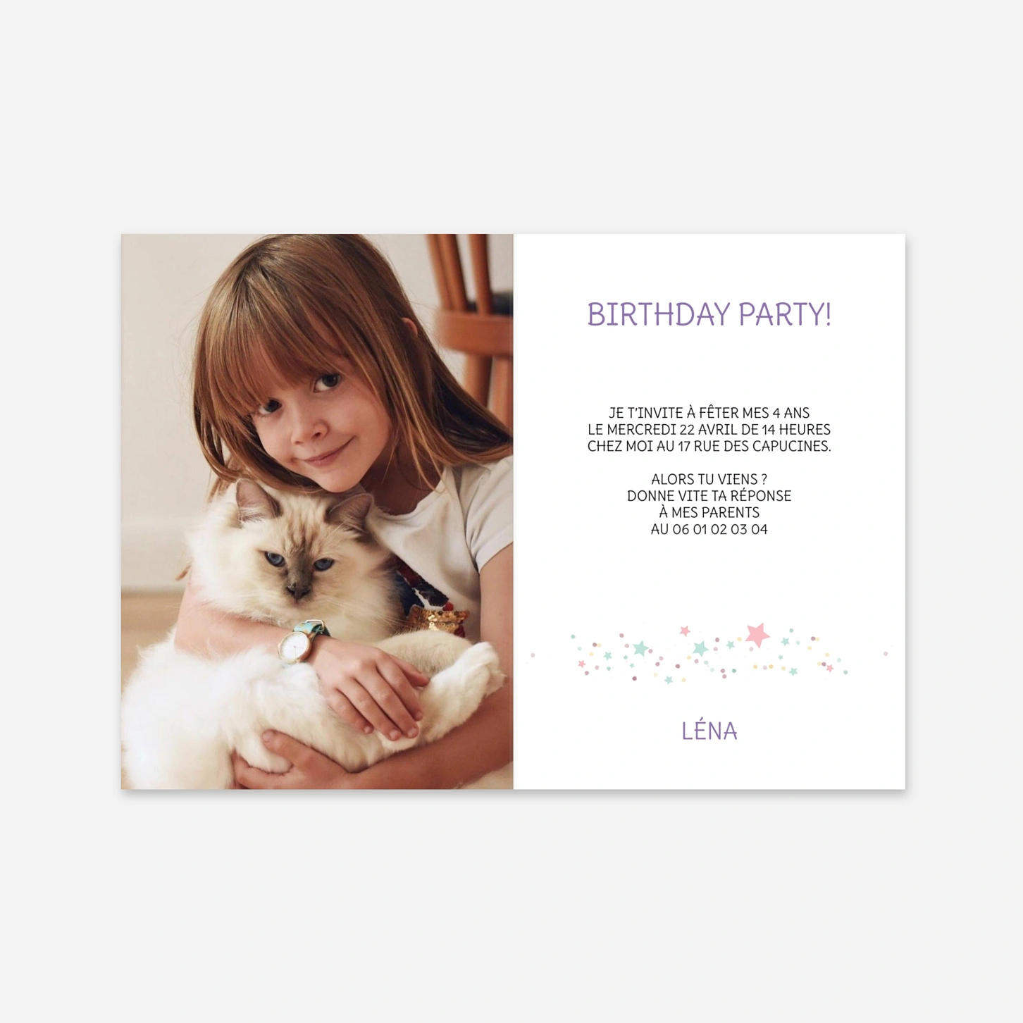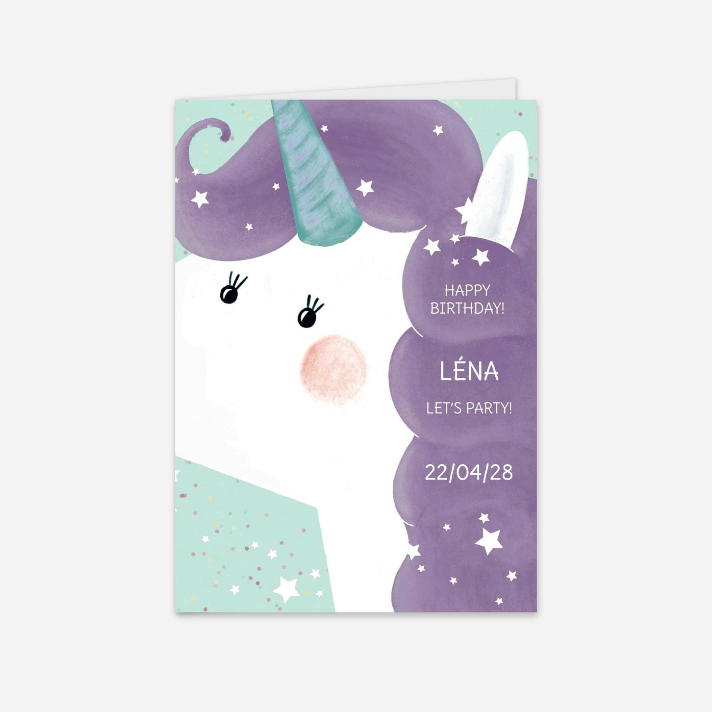 Plongez vos invités dans un univers de conte de fées avec l'invitation d'anniversaire « Douce licorne », une création originale imaginée par nos designers pour émerveiller les petits comme les grands. Ce modèle poétique et parsemé d'étoiles vous permet de partager tous les détails de cette journée magique grâce à une configuration facile de votre texte et de vos photos personnalisés. Chaque carte est imprimée avec le plus grand soin dans nos propres ateliers de production afin de vous garantir un rendu étincelant. Offrez à votre enfant une annonce aussi unique que sa fête et préparez-vous à vivre un moment inoubliable. Personnalisez votre modèle en ligne dès maintenant pour donner vie à cette jolie attention.
