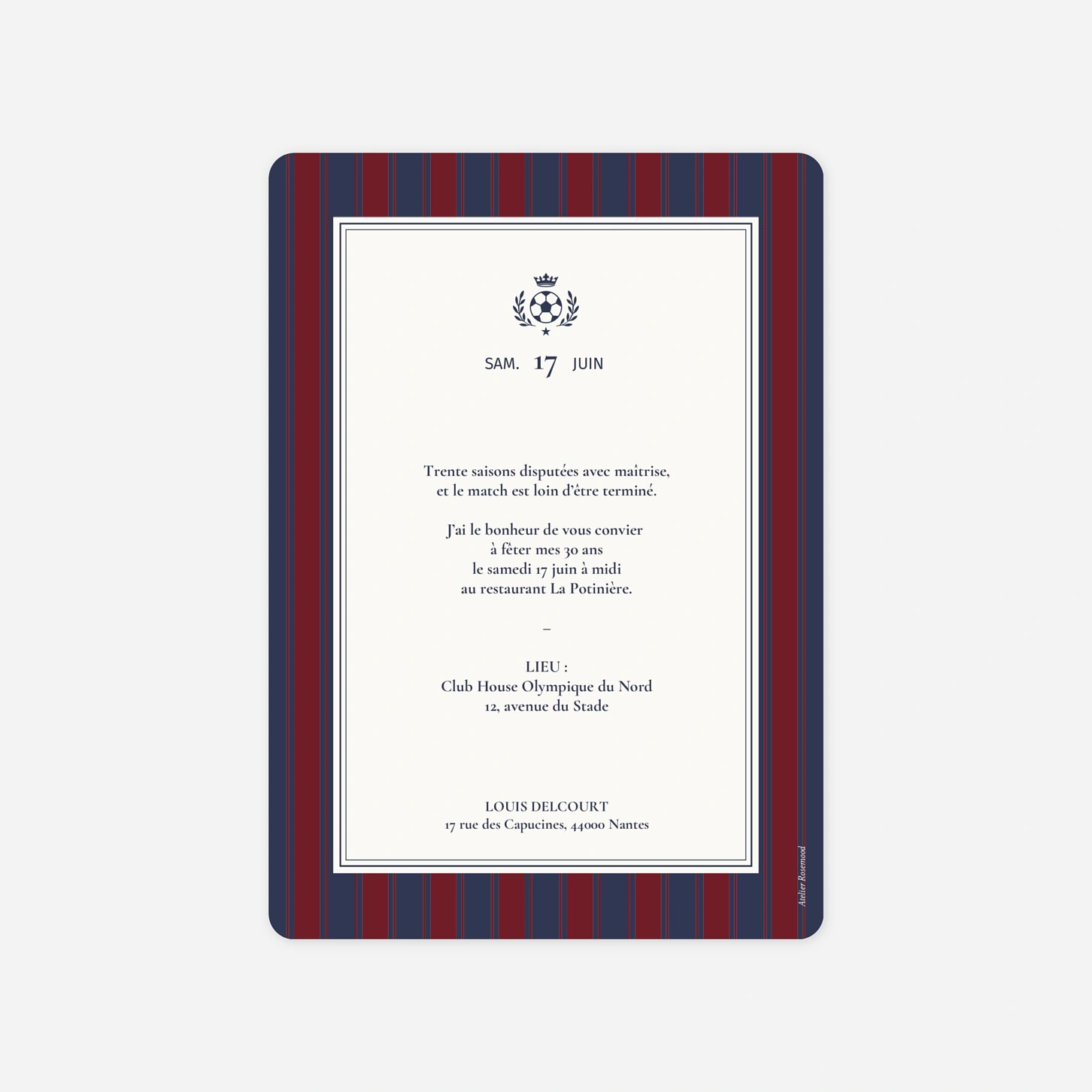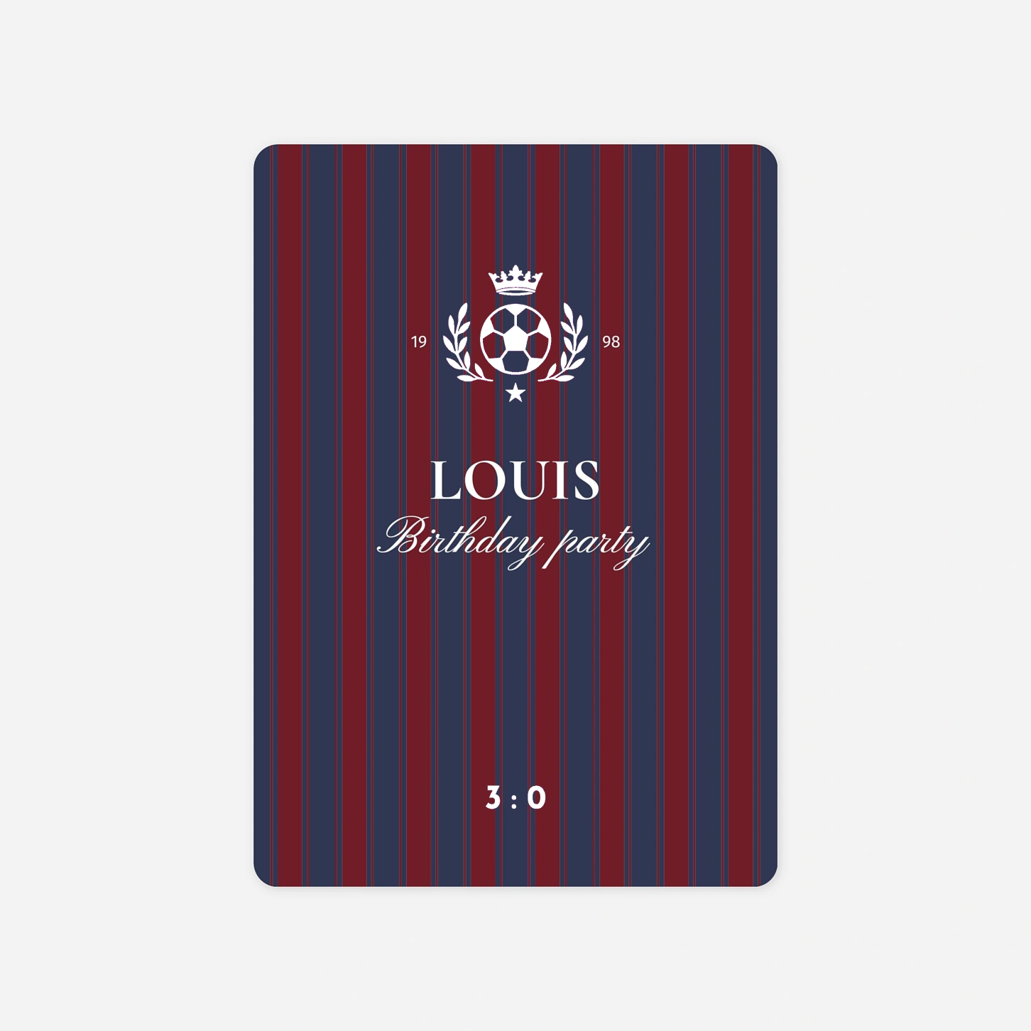 Affichez vos couleurs avec l'invitation d'anniversaire « Le club », un modèle au style résolument sportif et élégant pour marquer votre nouvelle saison. Inspirée par les codes graphiques des clubs prestigieux, cette création originale utilise des rayures classiques et des blasons personnalisables pour annoncer votre événement avec dynamisme. Nos modèles sont tous conçus en interne et imprimés avec passion dans nos propres ateliers de production en France et en Allemagne. Grâce à notre outil d'édition, profitez d'une configuration facile du texte pour transformer cette carte en une invitation personnalisée qui vous ressemble. Personnalisez votre ensemble en ligne dès maintenant pour inviter vos proches à rejoindre votre équipe le temps d'une fête inoubliable.