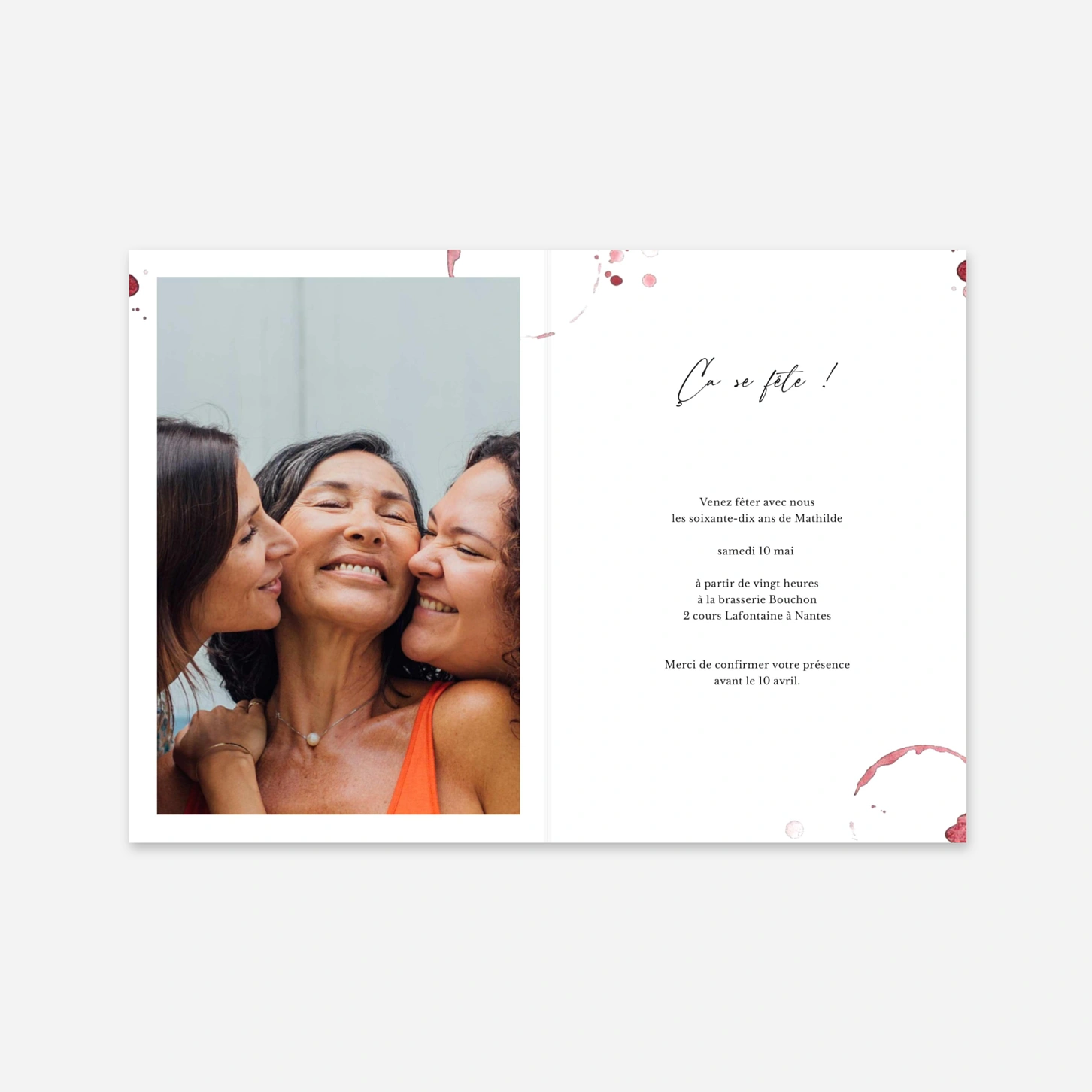 Annoncez une célébration d'exception avec l'invitation d'anniversaire « Millésime », un modèle qui rend hommage aux grandes occasions avec une touche artistique. Ses délicates illustrations de verres à vin à l'aquarelle évoquent la convivialité d'un grand cru et se prêtent parfaitement à une invitation personnalisée pour un passage de dizaine. Toutes nos créations sont conçues en interne pour nos clients et imprimées avec soin au cœur de nos propres ateliers de production en France et en Allemagne. Grâce à notre outil d'édition, la configuration de votre texte et de vos photos est un véritable jeu d'enfant pour un rendu final empreint d'élégance. Personnalisez votre modèle en ligne dès maintenant pour inviter vos proches à lever leur verre avec vous.