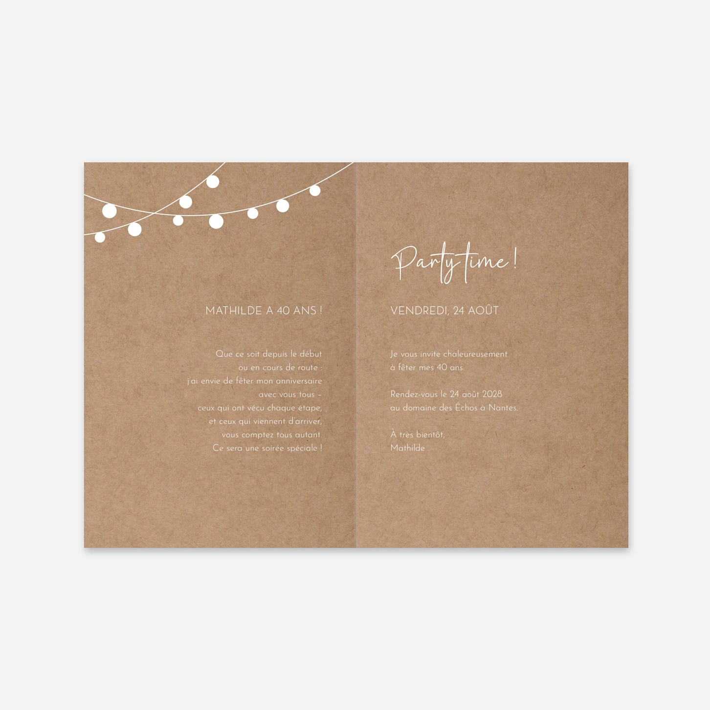 Invitez vos proches à célébrer votre nouvelle année avec l'invitation anniversaire « Sous les lampions », une création à l'esprit joyeux et festif. Ce modèle met en lumière votre plus beau portrait, encadré par de délicates guirlandes lumineuses qui évoquent la douceur des soirées de fête en plein air. Chaque carte est imprimée avec un soin infini au sein de nos propres ateliers afin de garantir l'éclat de vos souvenirs. Profitez d'une configuration facile du texte et des photos pour envoyer un message personnalisé qui donnera le ton de votre événement. Personnalisez votre ensemble en ligne dès maintenant.