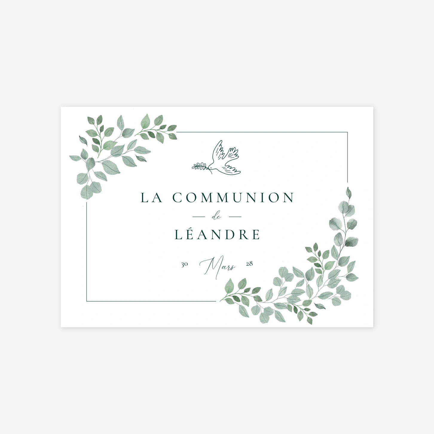 Ornée de tendres feuilles d’eucalyptus et d’un liseré doré, l’invitation pour communion « Délicats rameaux » apportera une touche de fraîcheur et de poésie à votre annonce. Ce modèle végétal au design épuré est idéal pour convier vos proches à célébrer cette étape importante de la vie de votre enfant. Nos propres ateliers s'occupent d'imprimer votre création avec une haute précision pour un rendu impeccable. Grâce à notre outil d’édition, il est très facile de personnaliser votre texte et la mise en page selon vos envies. Personnalisez votre ensemble en ligne dès maintenant pour un souvenir unique et élégant.