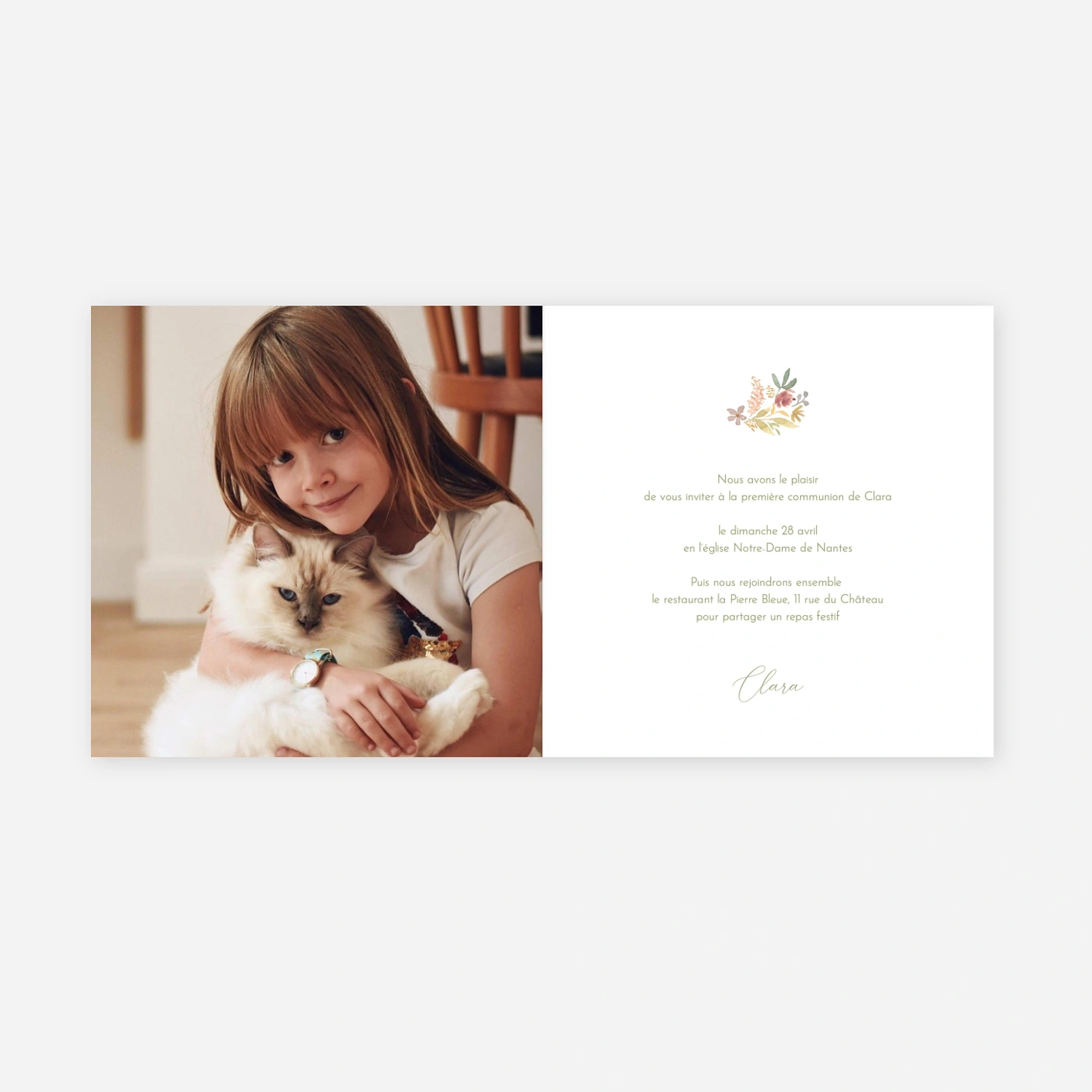 Ornée d'une délicate illustration aquarellée, l'invitation baptême et communion « Douce croix » sublimera l'annonce de ce bel événement spirituel avec poésie. Ce modèle champêtre met en lumière une croix végétale tout en finesse, idéale pour convier vos proches à partager ce moment de joie. Grâce à notre outil d'édition, vous pourrez facilement personnaliser le texte et intégrer votre plus belle photo au recto. Chaque carte est imprimée avec soin dans nos propres ateliers de production pour vous garantir une qualité exceptionnelle. Personnalisez votre création en ligne dès maintenant pour un souvenir unique.