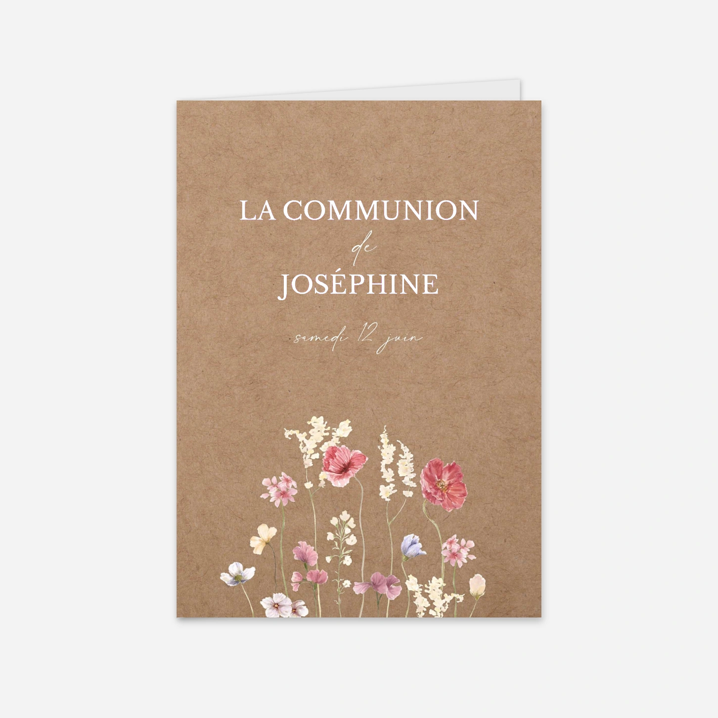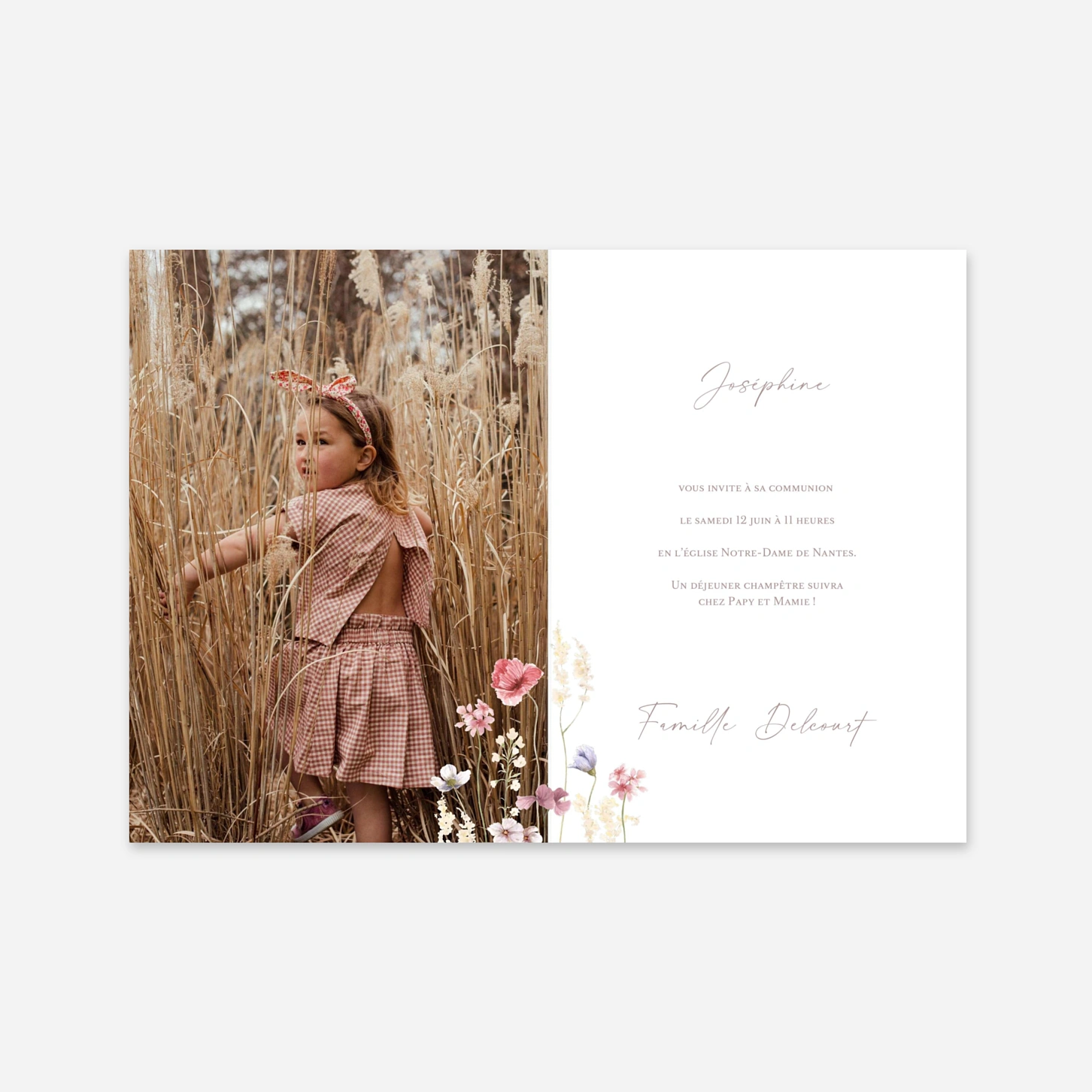 Annoncez cette célébration printanière avec tendresse grâce au faire-part de communion « Jardin de douceur », une création qui fleure bon la nature et la sérénité. Ce modèle se pare d'élégantes illustrations florales à l'effet aquarelle, apportant une touche de poésie et de fraîcheur à votre annonce. Imaginé par nos designers et imprimé avec soin dans nos propres ateliers, ce faire-part garantit un rendu délicat sur nos plus beaux papiers premium. Profitez d'une configuration facile du texte pour convier vos proches à cet événement spirituel avec une invitation qui vous ressemble. Personnalisez votre ensemble en ligne dès maintenant.
