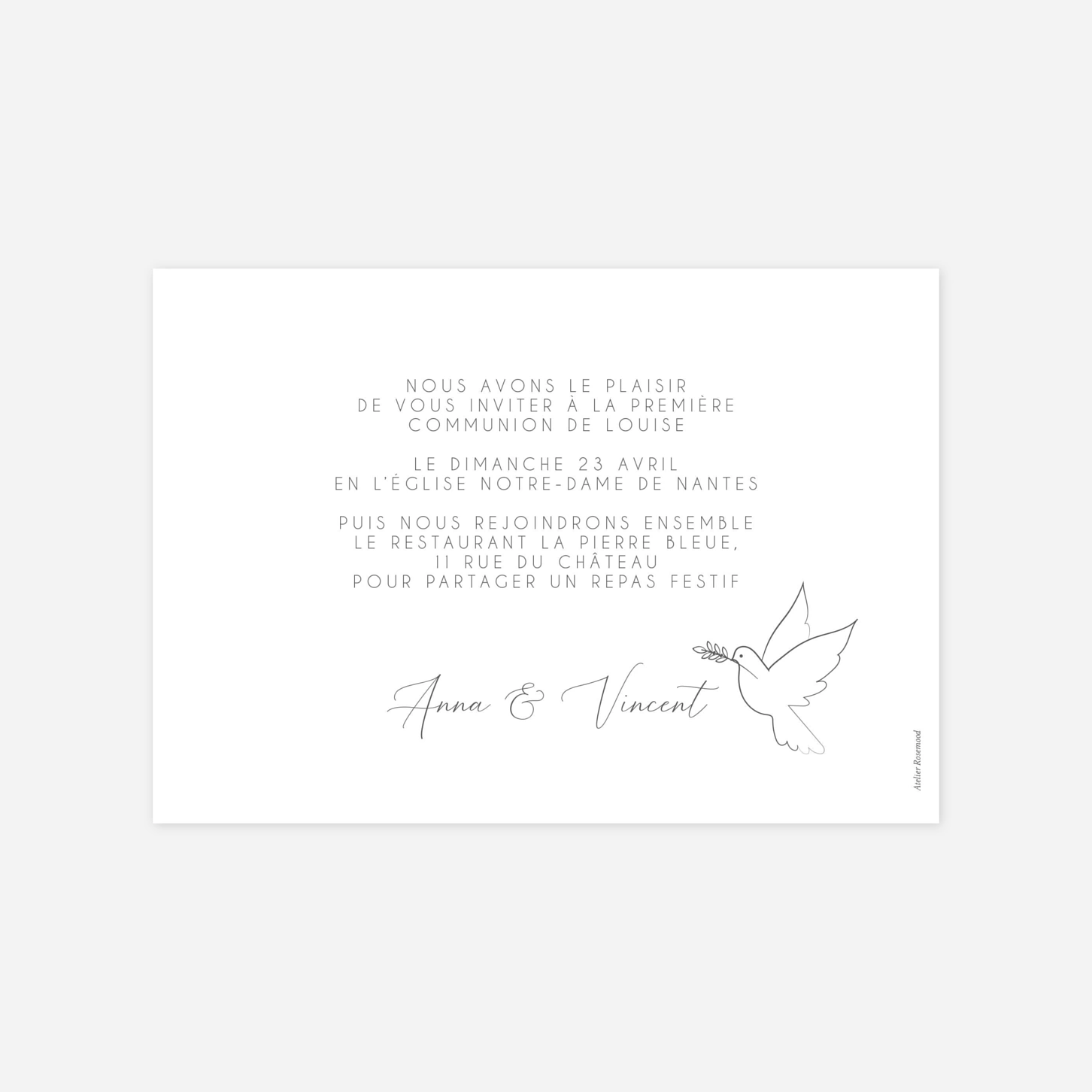 Portée par un souffle de légèreté, l'invitation de communion « Écriture Dorée » annonce avec une élégance intemporelle cette étape importante de la vie de votre enfant. Son design épuré, rehaussé d'une délicate illustration de colombe, mettra merveilleusement en valeur votre plus beau cliché de famille. Ce modèle a été imaginé par nos créateurs internes et se personnalise très facilement avec votre texte pour convier vos proches à partager ce moment de joie. Nos propres ateliers de production apportent un soin tout particulier à l'impression de vos cartes pour vous garantir un rendu d'une qualité exceptionnelle. Personnalisez votre ensemble de communion en ligne dès maintenant pour un souvenir inoubliable.