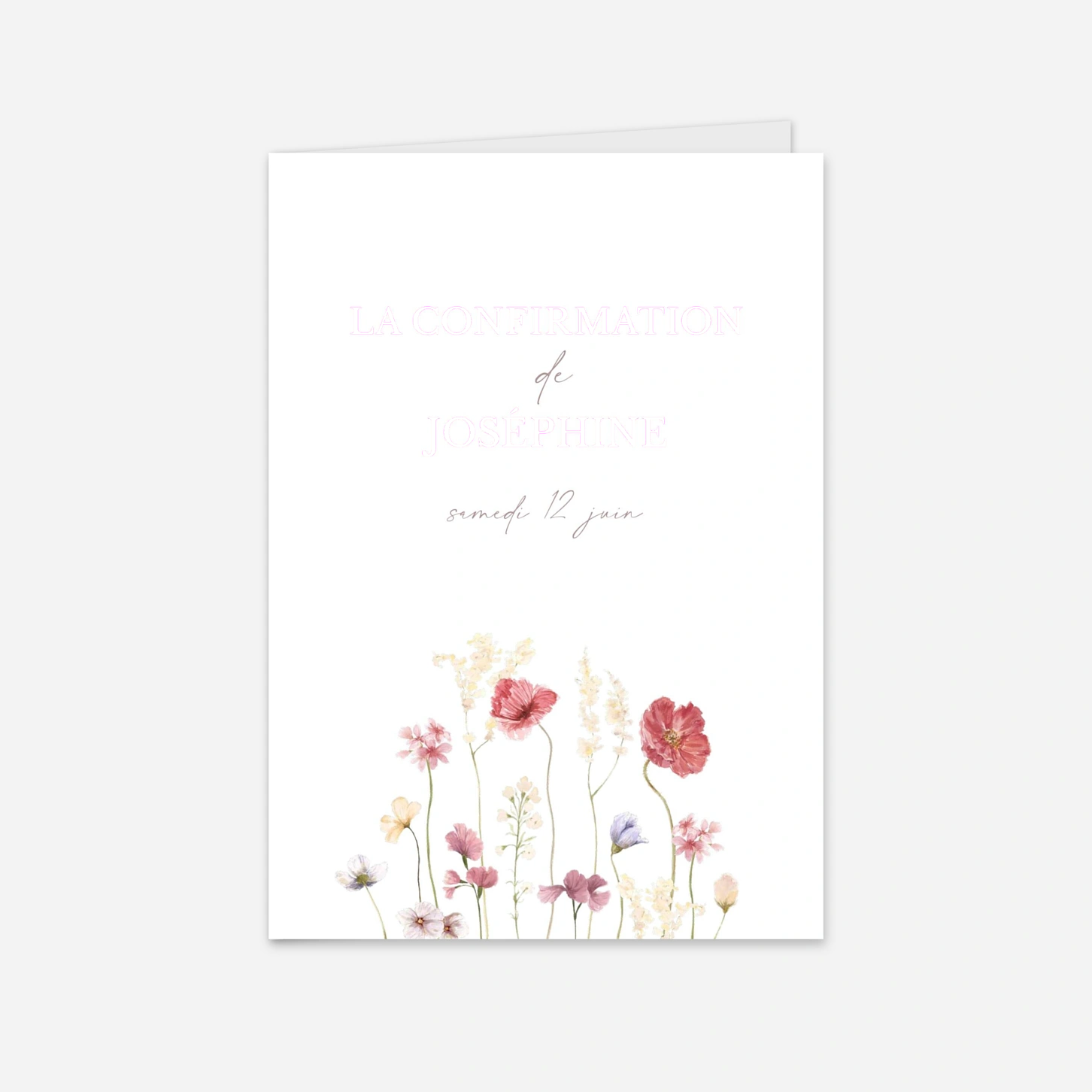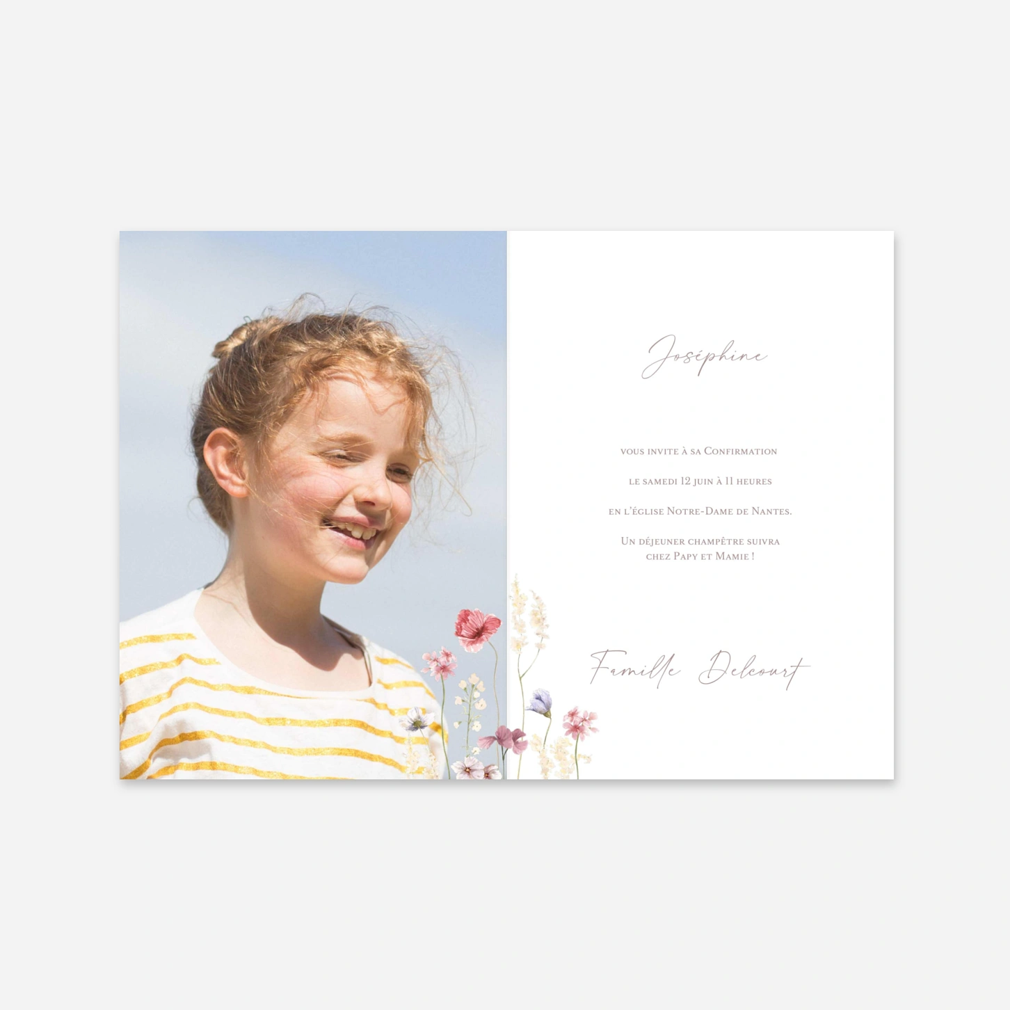 Grâce à ses délicates illustrations de fleurs des champs à l'esprit aquarelle, l'invitation de confirmation « Jardin de douceur » transmettra votre message avec une infinie tendresse. Ce modèle champêtre et élégant met parfaitement en lumière le prénom de votre enfant pour convier vos proches à ce bel événement printanier. Toutes nos créations sont imaginées en interne puis imprimées avec soin sur nos papiers premium dans nos propres ateliers. Vous pouvez facilement personnaliser votre texte ainsi que la mise en page de votre carte depuis notre outil d'édition en ligne.