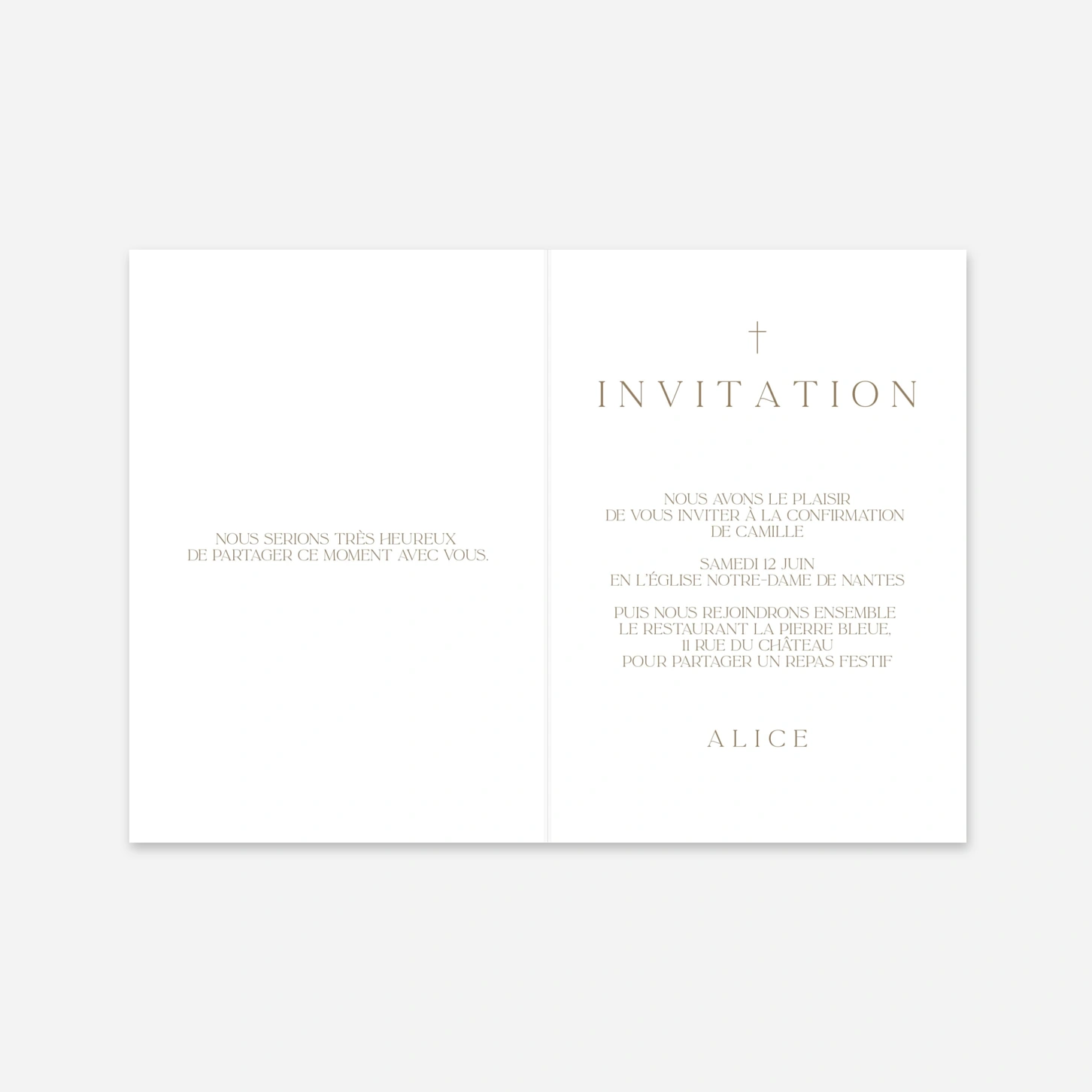 Annoncez cette belle étape de vie avec une élégance lumineuse grâce à l’invitation de confirmation « Tendre bénédiction ». Son format photo plein cadre met en lumière le plus beau portrait de votre enfant, créant un souvenir précieux et personnel pour votre entourage. Toutes nos créations sont imaginées en interne par nos designers pour offrir à vos événements une signature unique et soignée. Nous assurons une impression haute précision dans nos propres ateliers afin de garantir un rendu éclatant à vos clichés. Personnalisez facilement votre texte et vos photos en ligne pour convier vos proches à ce moment empreint de sérénité.