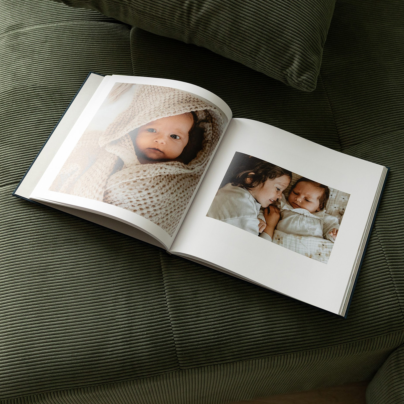 Nos albums photo avec une couverture en tissu sont disponibles en 7 coloris élégants. Du vert profond à la douceur du bleu céleste ou du beige, en passant par un jaune... nous vous proposons une sélection de teintes à la fois tendances et intemporelles pour que chacun puisse trouver la couleur de couverture qui lui correspond. Vous avez la possibilité d'apposer le titre de votre choix en dorure à chaud sur la couverture et sur le dos du livre. Doté d'une tranchefile colorée et de pages de garde fabriquées dans un papier à fort grammage teinté dans la masse, chaque album photo est impeccablement soigné et a tout d'un véritable ouvrage d'art personnalisé. Nos albums photo tissu peuvent être accompagnés d'un coffret en option. Il fera de votre livre un cadeau précieux à offrir à vos proches pour Noël ou un anniversaire.