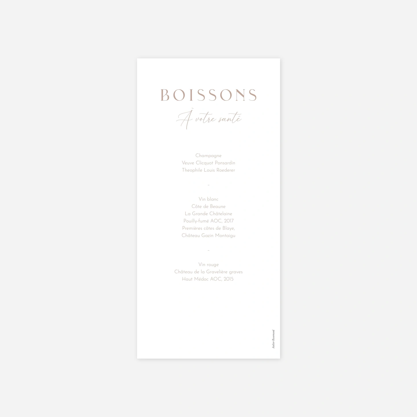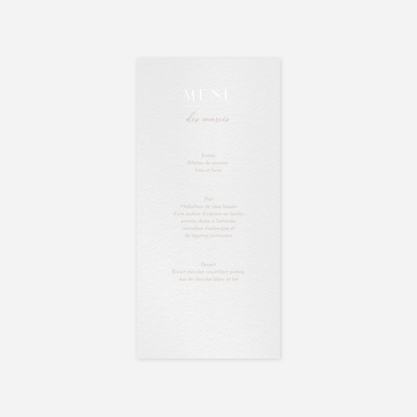 Élément incontournable de votre papeterie de table, le design de votre menu est à choisir avec soin et attention afin qu’il reflète parfaitement le thème que vous avez imaginé pour votre jour J. Grâce à notre outil de création en ligne, vous pourrez facilement ajouter les détails de votre menu, met après met, pour éveiller l'appétit de vos invités.