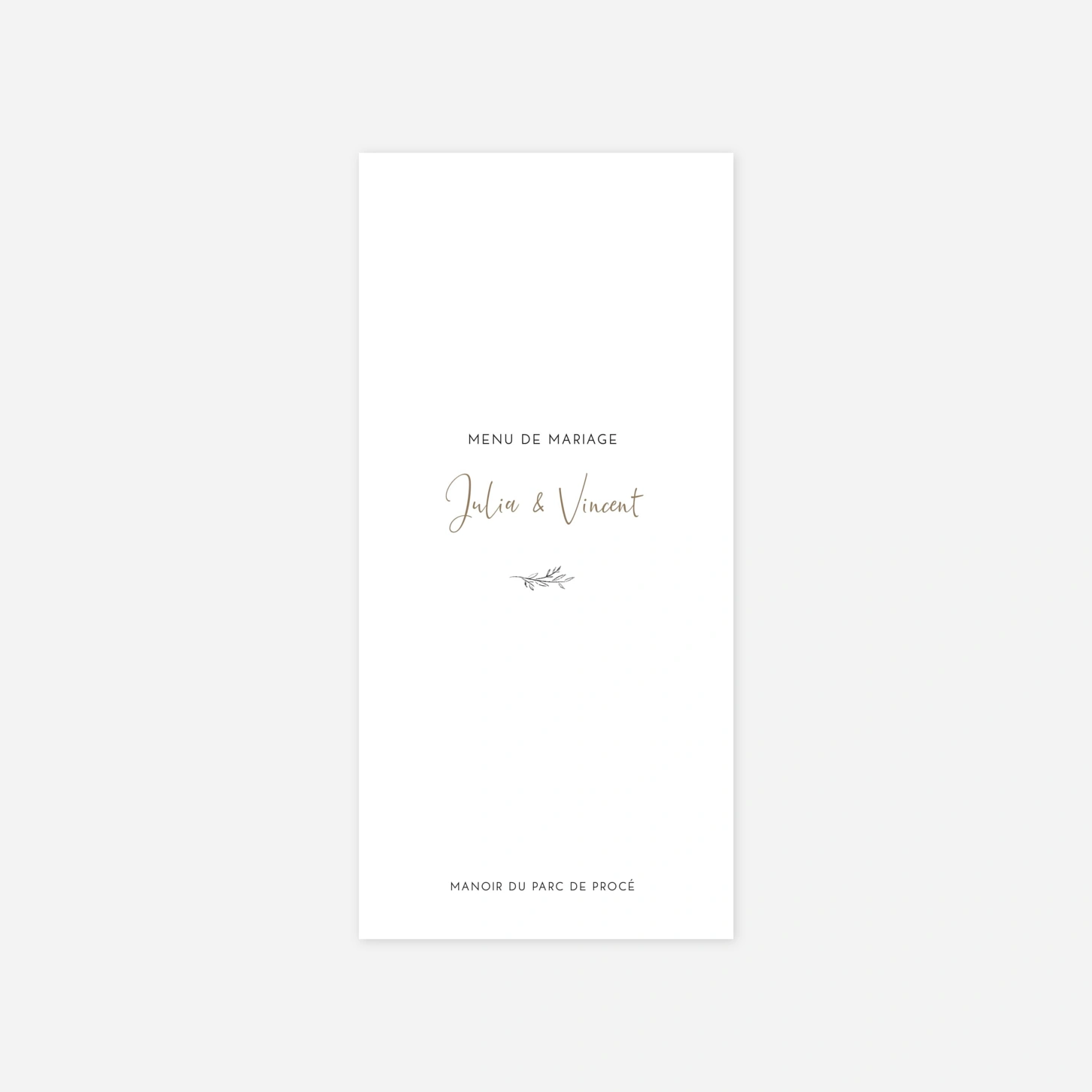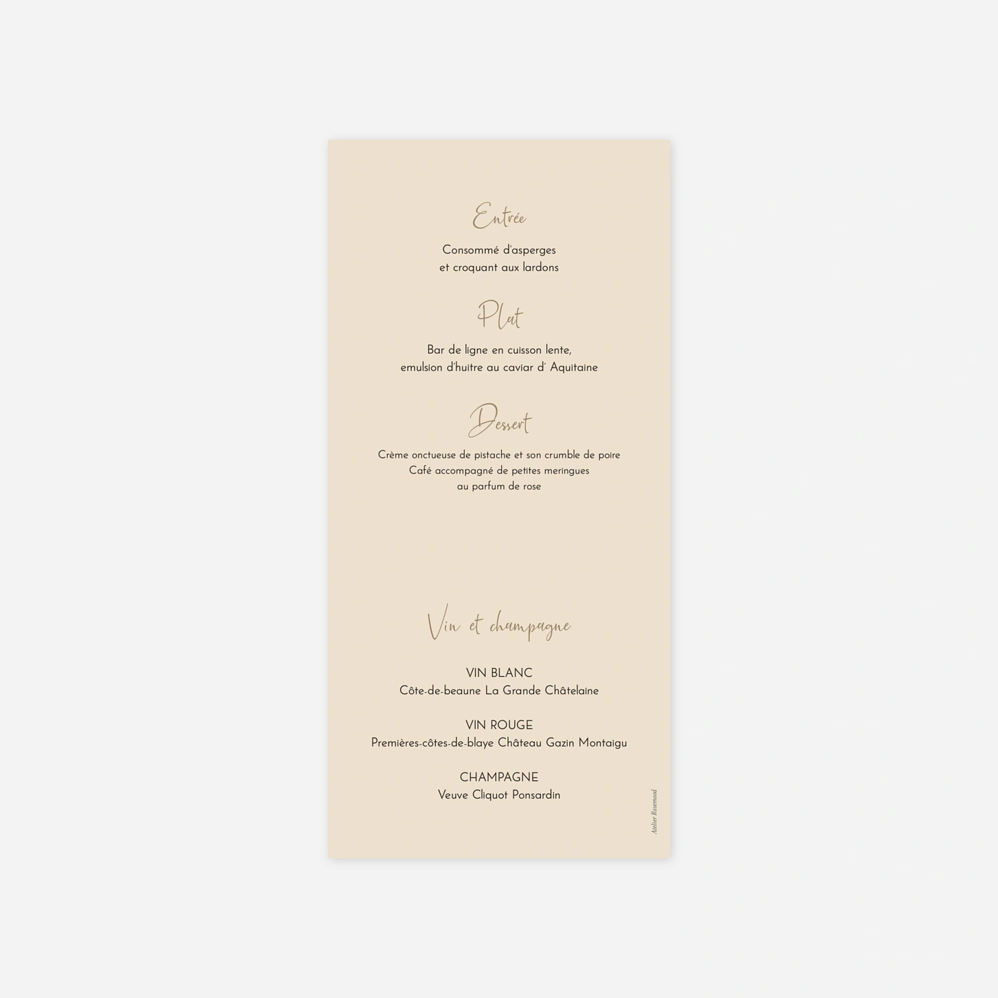 Élément incontournable de votre papeterie de table, le design de votre menu est à choisir avec soin et attention afin qu’il reflète parfaitement le thème que vous avez imaginé pour votre jour J. Grâce à notre outil de création en ligne, vous pourrez facilement ajouter les détails de votre menu, met après met, pour éveiller l'appétit de vos invités.