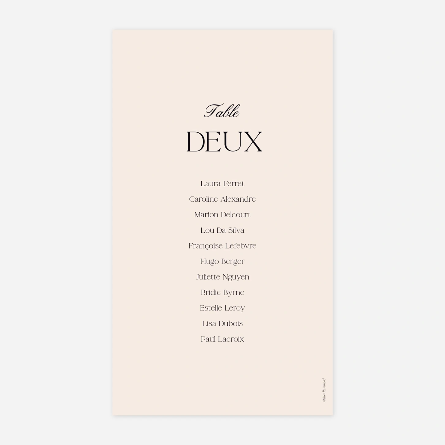 Le plan de table mariage « Fleur minimale » est un élément clé de votre réception. Assorti à votre papeterie et souvent disposé à l’entrée de votre lieu de réception, il indiquera à vos convives où et avec qui ils seront installés pour le dîner. Sur notre éditeur en ligne, créez autant de cartes que le nombre de vos tables, inscrivez le numéro ou le nom choisi pour chaque table et la liste des invités. Vous pourrez personnalisez la mise en forme du texte selon vos envies.