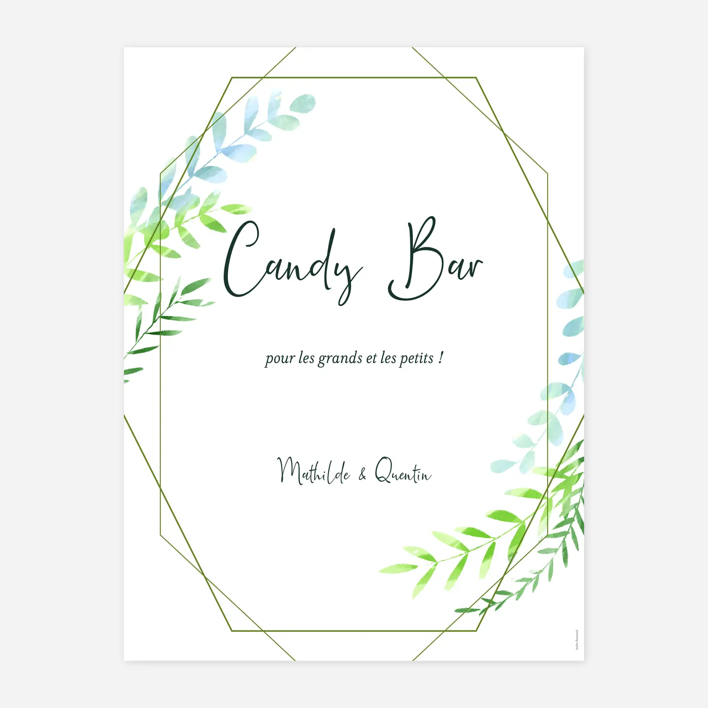 Les élégants feuillages du panneau mariage Enchanté apporteront une touche de nature à chaque endroit clé de votre réception. Leurs délicates nuances révélées par l’aquarelle s’harmonisent avec un cadre plus graphique pour un rendu moderne et original. Vous aurez le choix entre des nuances de vert et de jaune ou de vert et de bleu pour les illustrations. Au milieu de l’illustration ressort votre texte, inscrit dans une typographie au style manuscrit. Présenté ici en panneau pour le candy bar, vous pourrez le personnaliser avec l’inscription de votre choix. Panneau de bienvenue, affiche pour la table du buffet, du livre d’or ou pour le stand du photobooth… créez de jolies pancartes assorties au thème champêtre de votre décoration. Nos panneaux de mariage sont au format A3 (30x40 cm) et pourront être affichés au mur dans un joli cadre, exposés sur des chevalets ou bien accrochés à une guirlande lumineuse.