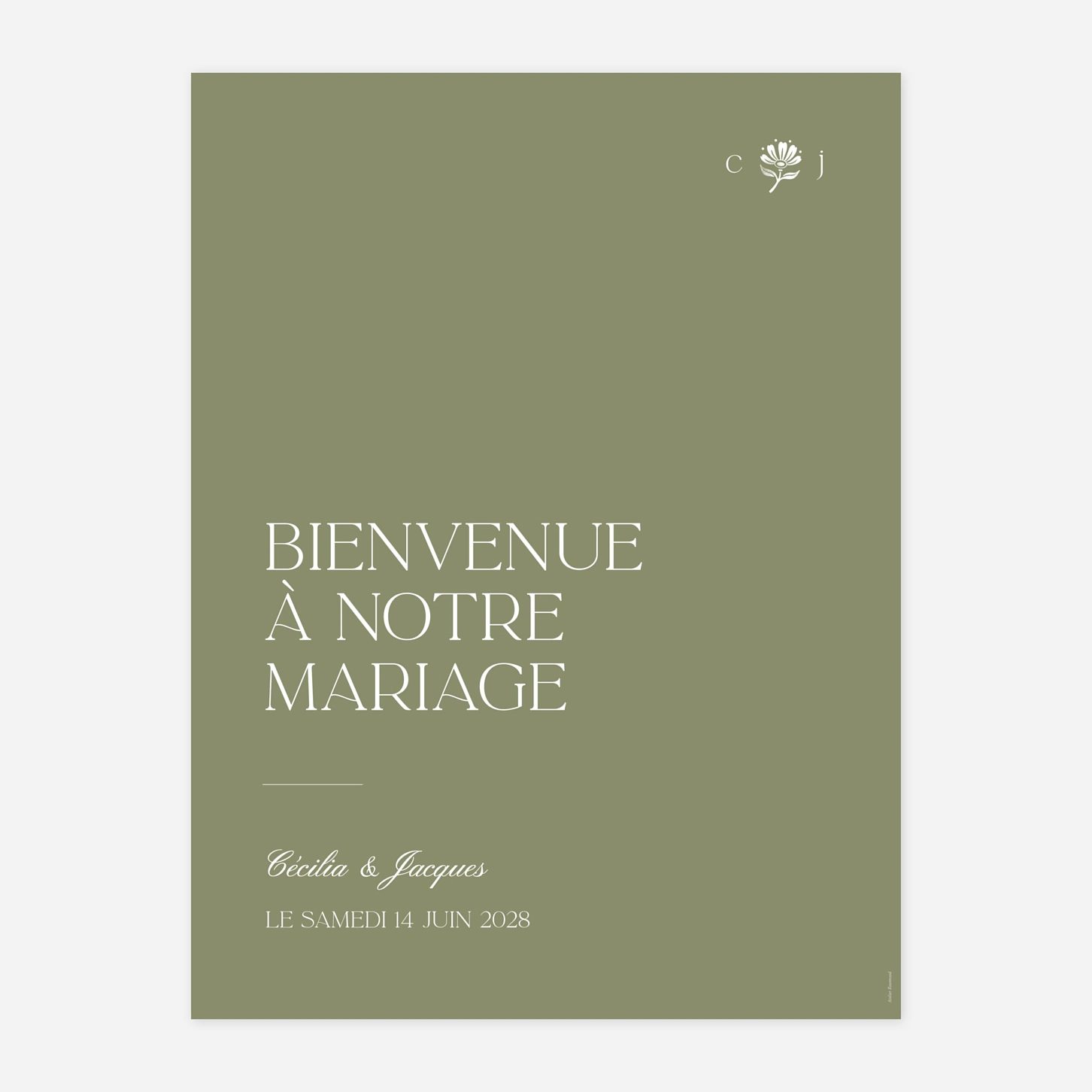 Nos panneaux de mariage peuvent se placer à l’entrée de votre salle pour souhaiter la bienvenue à vos convives et à chaque endroit clé de votre réception. Créez sur notre éditeur en ligne autant de panneaux que vous le souhaitez, à personnaliser avec vos propres messages : un mot de bienvenue, l’indication du buffet gourmand, du stand photo ou du livre d’or. Leur format A3 pourra trouver sa place partout : affiché dans un cadre, suspendu à un fil avec des pinces en bois ou accroché avec un joli porte-affiche. Retrouvez toute la papeterie assortie à ce panneau mariage dans la gamme « Fleur minimale ».