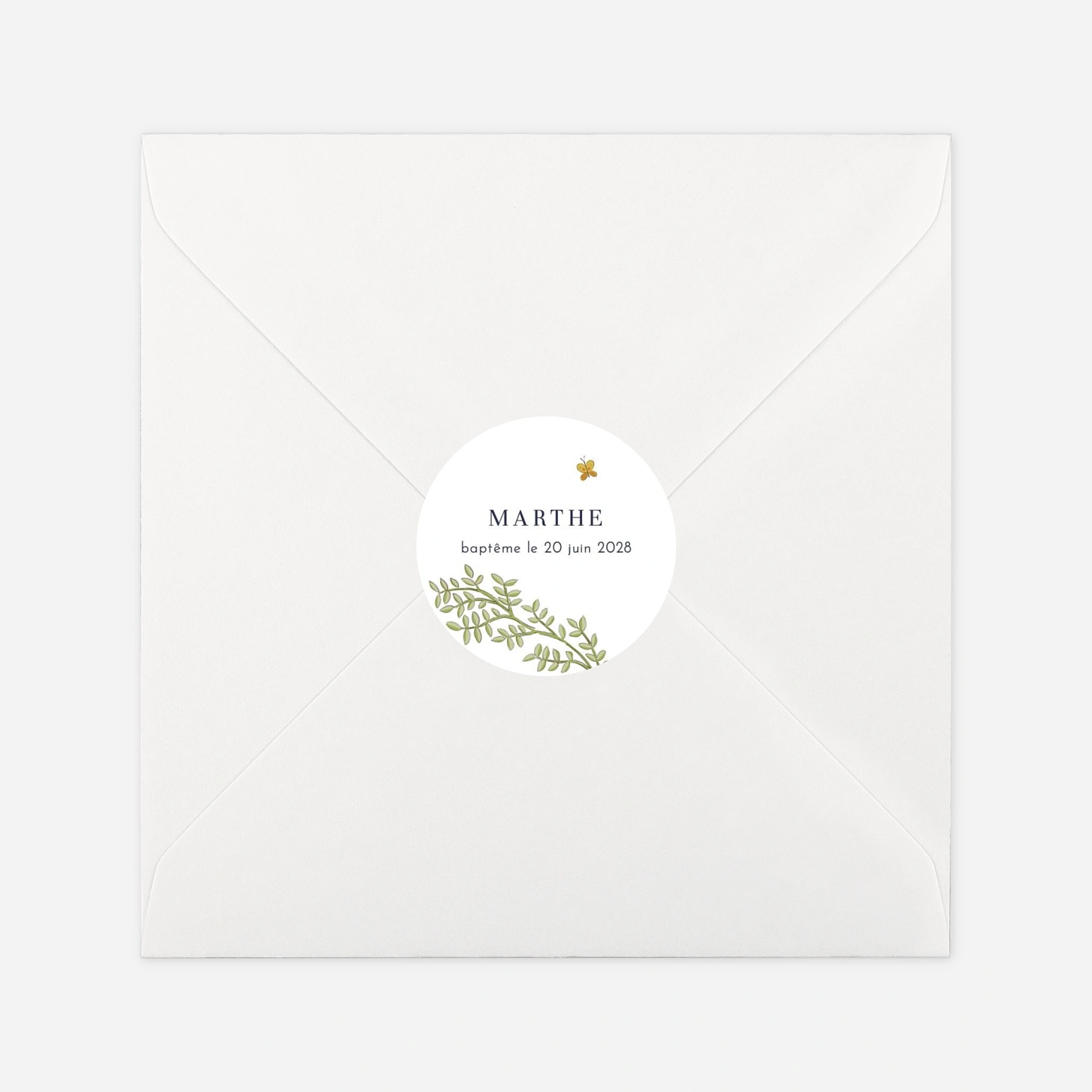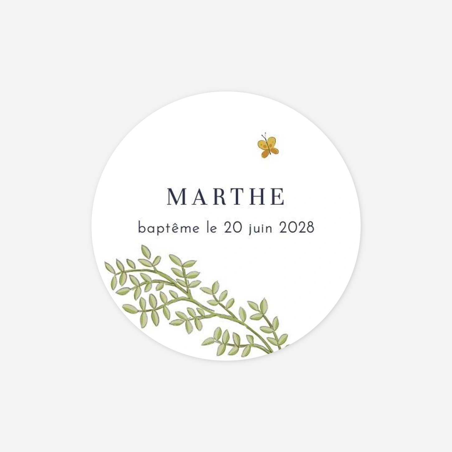 Apportez une touche de douceur et de tendresse à vos invitations, remerciements ou cadeaux invités avec le sticker baptême Histoire du jardin, illustré d’un délicat rameau et d’un petit papillon. Ce sticker se personnalise avec le texte de votre choix, vous permettant d’y faire figurer le prénom de votre enfant ou un petit mot personnalisé. Découvrez également les illustrations végétales de la gamme Histoire du jardin, qui vous permettront d’harmoniser l’ensemble de votre papeterie. N’hésitez pas à demander un échantillon gratuit pour apprécier la qualité de nos produits.