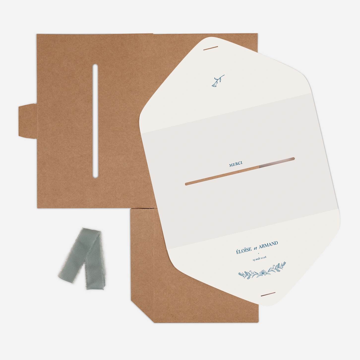 L’urne de mariage « Nature chic » sera idéale pour recueillir les cartes, enveloppes et petits mots de vos invités. Habillée d’un élégant papier cartonné et munie d’un ruban coloré, nous vous laissons le soin de l’assembler vous-même pour le jour J. Assortie à votre papeterie de table, elle sera un bel objet déco rappelant délicatement le thème de votre union.