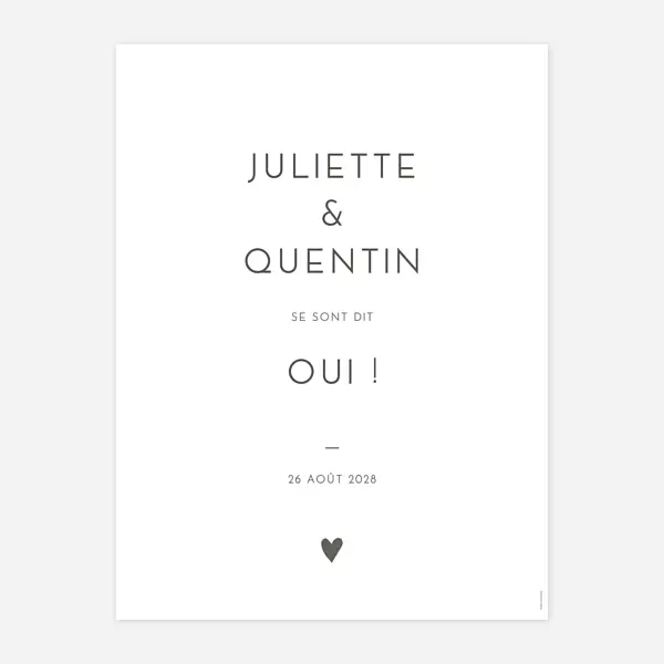 Vous pouvez également accompagner ces messages avec la date de votre mariage ou le lieu de votre réception. Le texte de nos affiches est entièrement personnalisable, vous pourrez donc créer des panneaux mariage pour chaque endroit clé de votre réception. En complément d’un panneau d’accueil personnalisé, vous pourrez donc également créer une affiche pour indiquer la table du livre d’or, de l’urne ou celle des cadeaux, un panneau pour le stand du photobooth, un poster pour le bar à cocktails ou le buffet… créez des pancartes personnalisées sur le thème de votre décoration. Nos panneaux mariage sont imprimés sur des papiers haut de gamme soigneusement choisis par nos experts innovation. Papier blanc mat, ou ivoire de création, choisissez votre finition selon le rendu souhaité pour vos affiches. L’impression est réalisée dans notre propre atelier, à la lisière de la forêt noire.